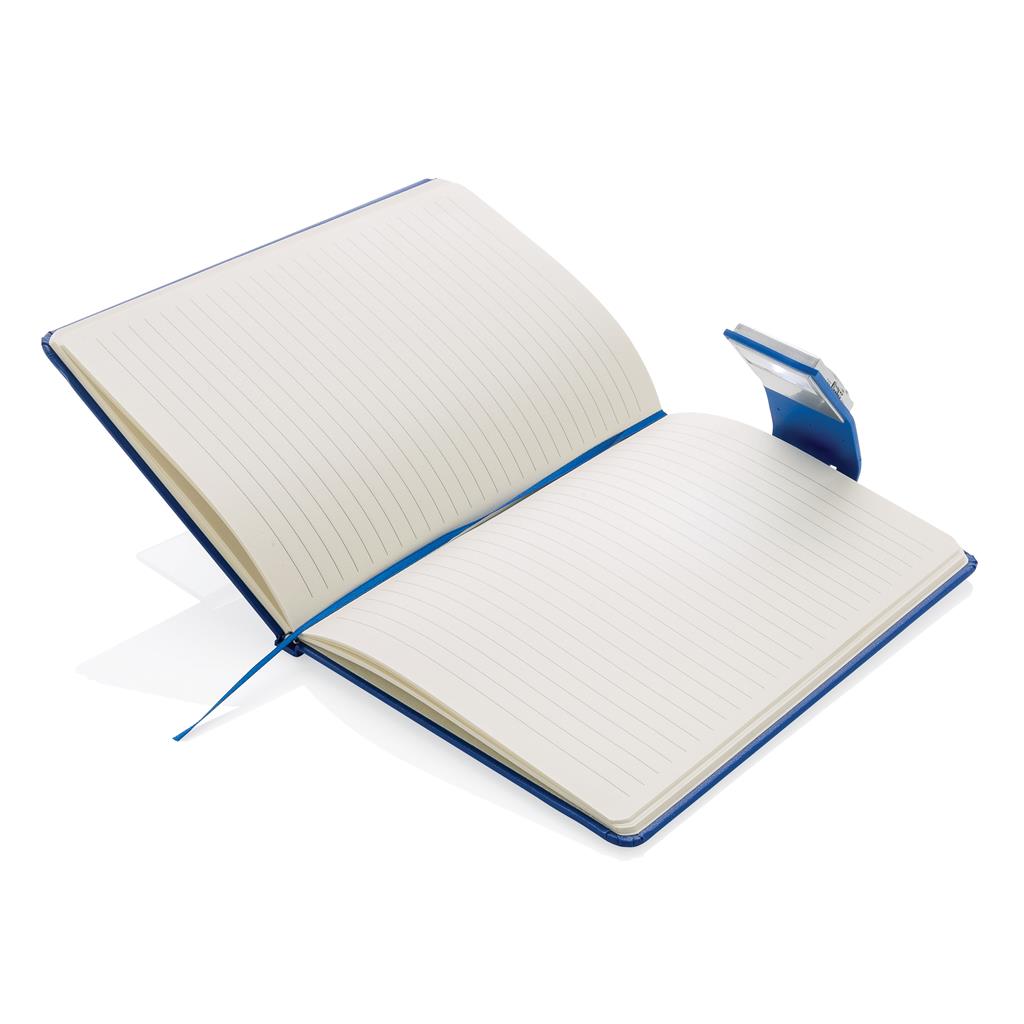 A5-kovakantinen standardi viivallinen muistikirja. Muistikirjassa on kirjanmerkki LED-valolla.
