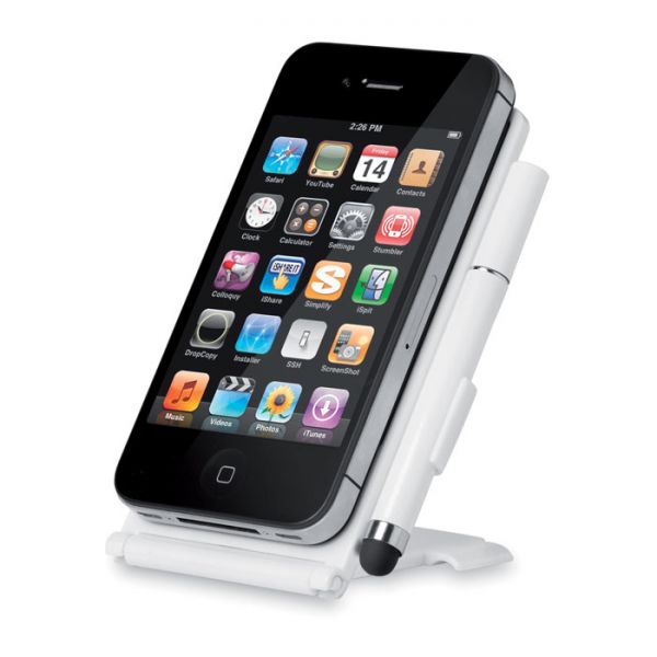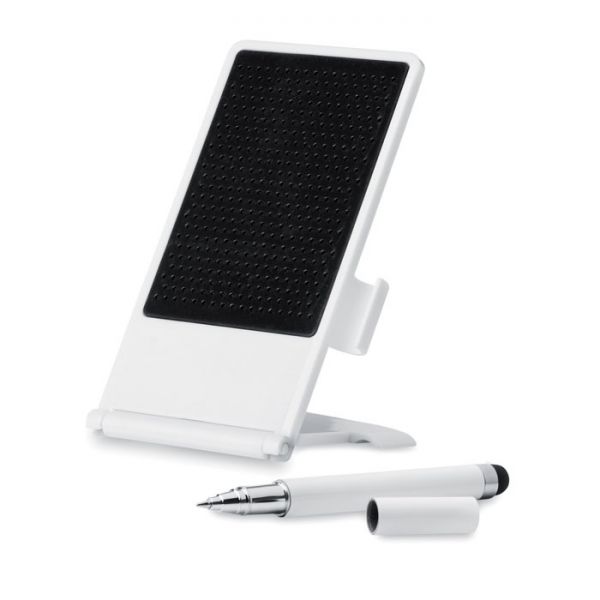 Taitettava älypuhelin jalusta jonka liukueste takaa puhelimen pysymisen telineessä. Mukana muovinen kuulakynä styluksella. Sininen muste. Tuotteen väri on valkoinen.