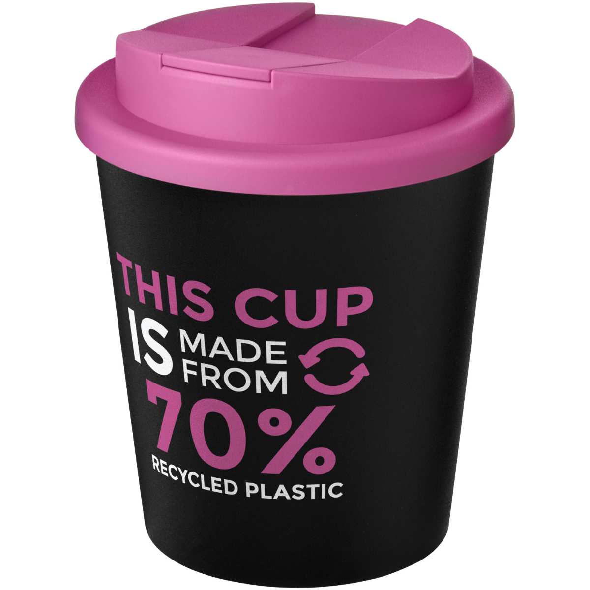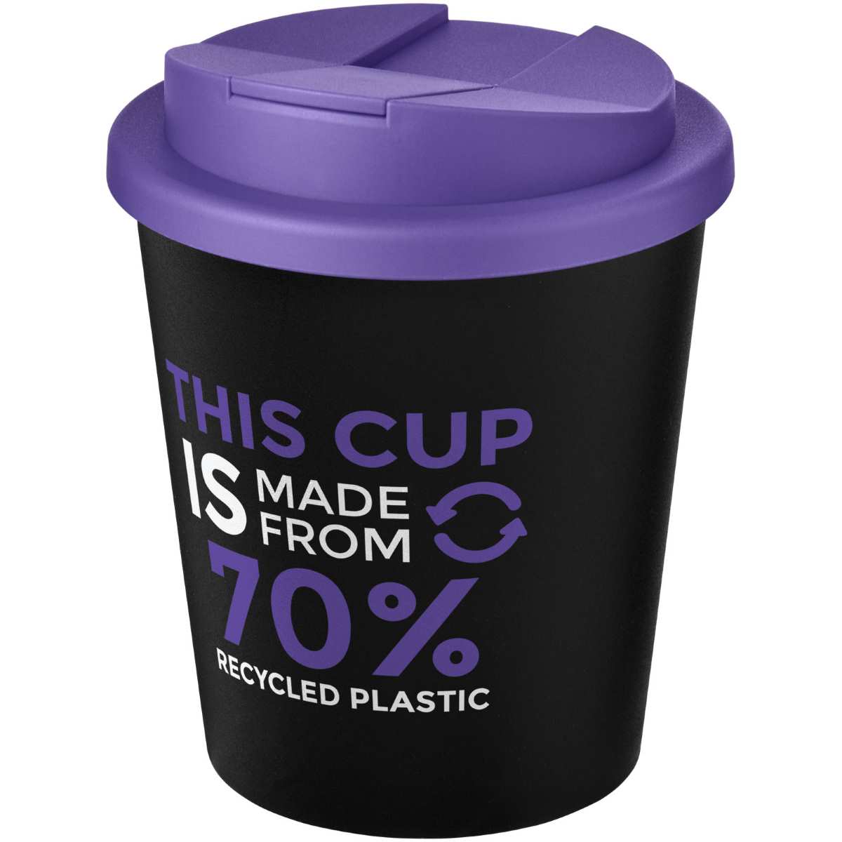 Kaksiseinäinen eristetty juomamuki, jossa on varma kierrettävä roiskumaton kansi. Kansi estää vuodot ja se on valmistettu ilman silikonia, joten muki on täysin kierrätettävissä. Mukiosa on valmistettu 100-prosenttisesti PP-kierrätysmuovista ja kansi elintarvikeluokan PP-muovista, kokonaisuus on näin 70% kierrätetty. Kierrätysmateriaalin luonteesta johtuen mustan sävy voi hivenen vaihdella. Tilavuus on 250 ml. Toimitetaan pussissa, jota voidaan käyttää kompostissa kotona. Valmistettu Britanniassa.