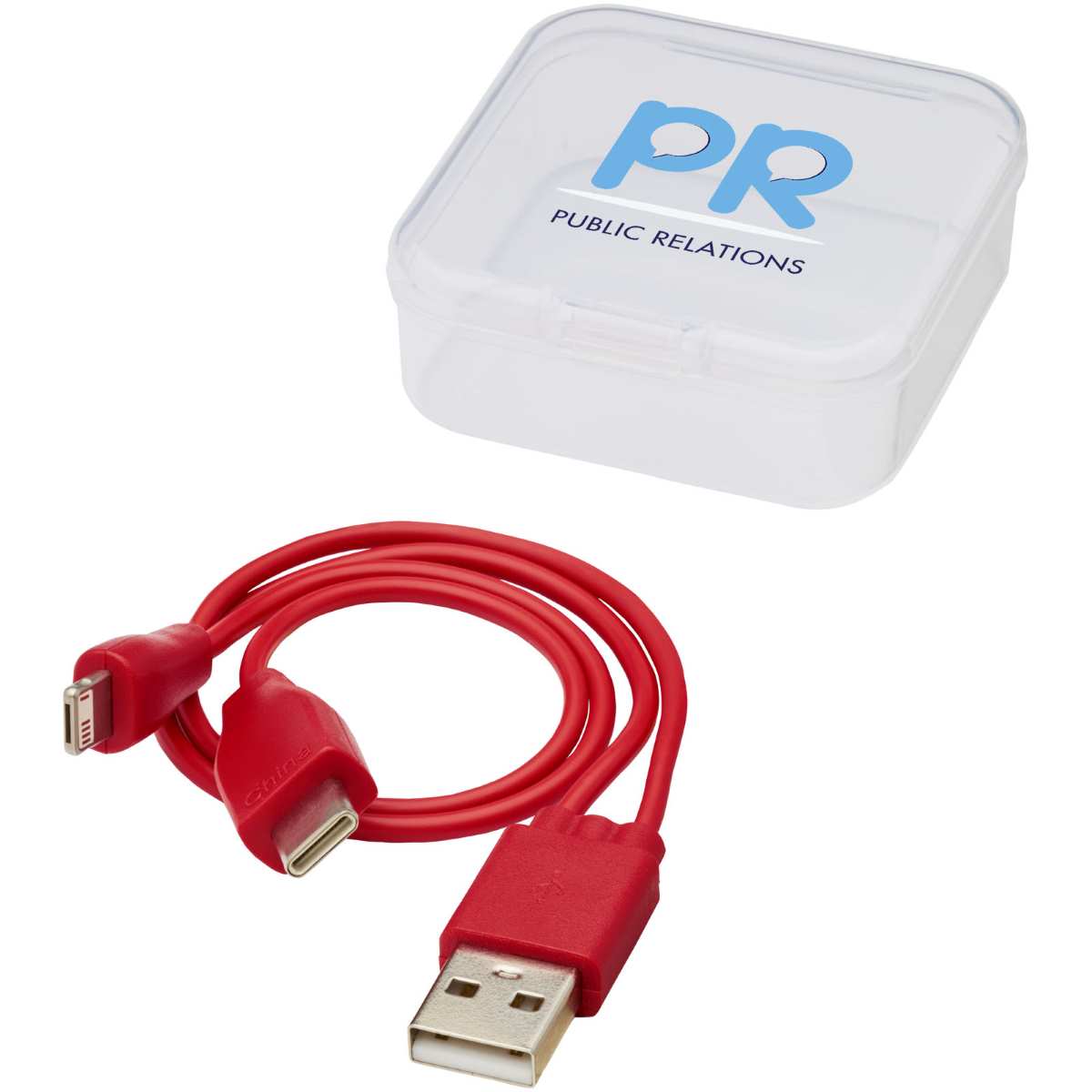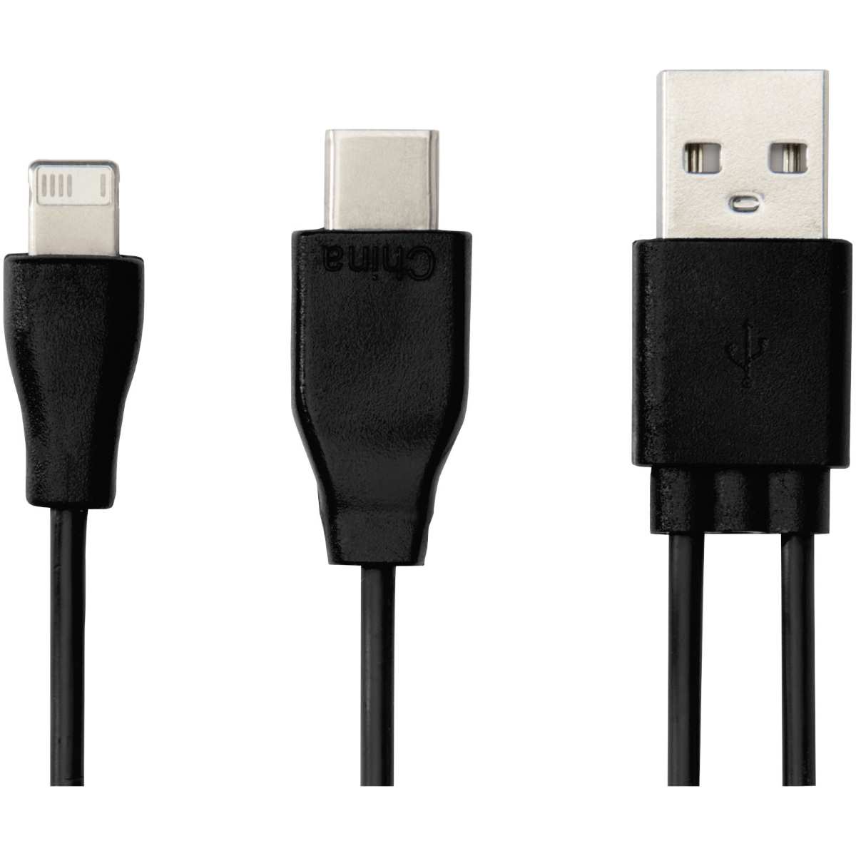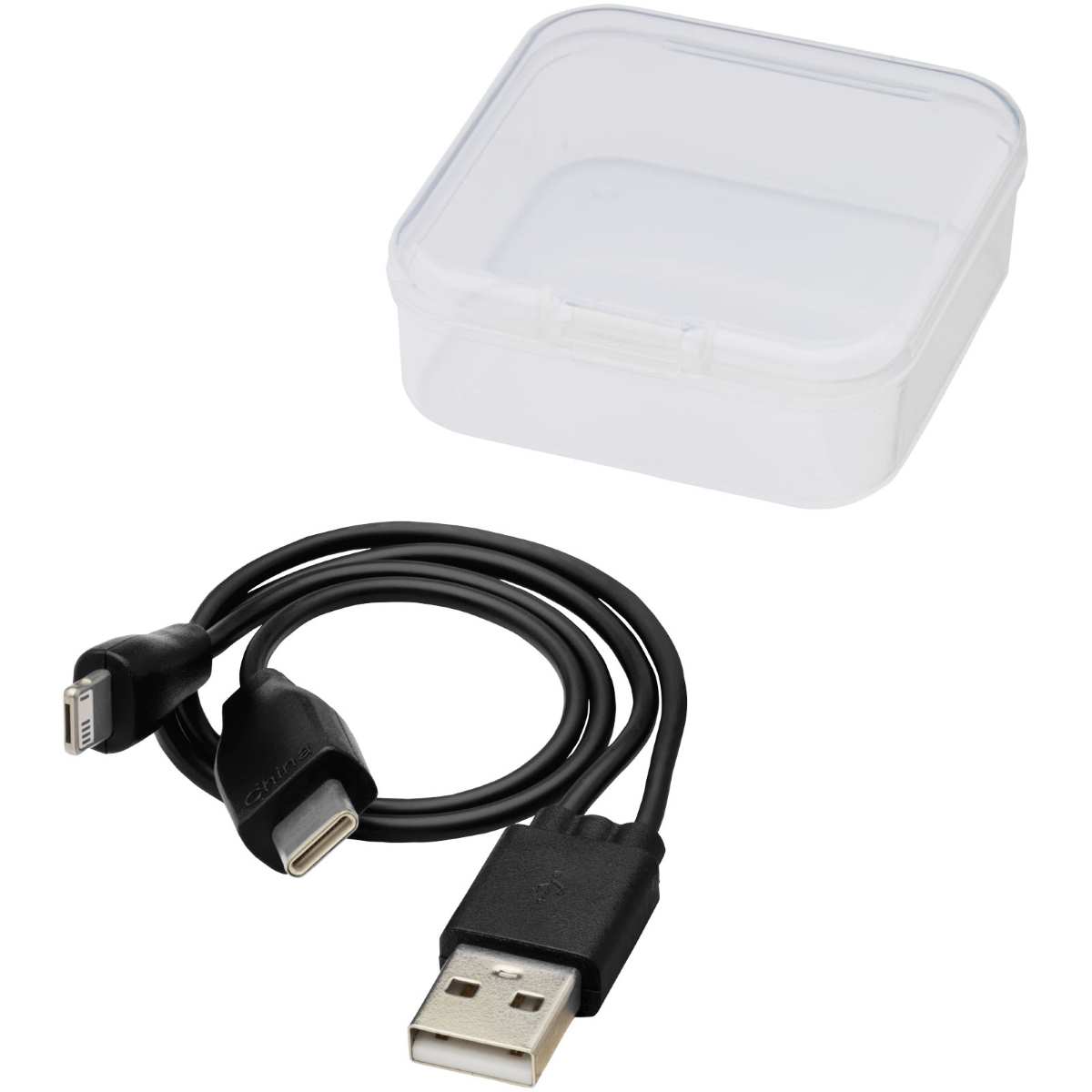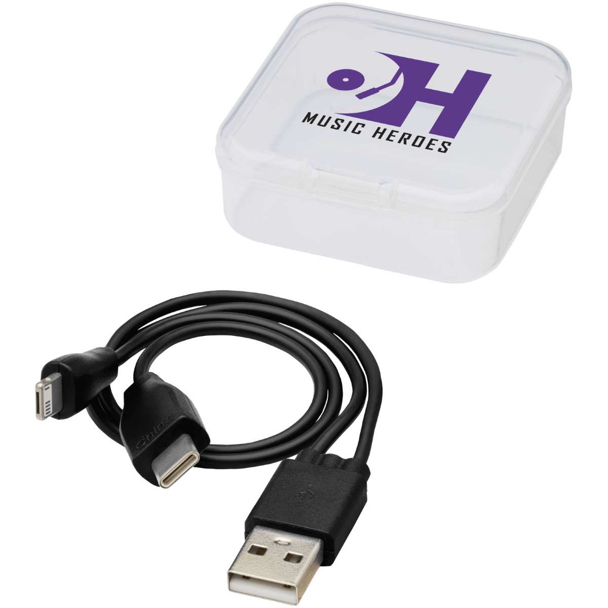 3-in-1 USB-latauskaapeli, jossa on C-tyypin USB-kärki sekä 2-in-1-kärki, ja se sopii sekä Apple® iOS- että Android-laitteille. Mikro-USB-lähtö ja 2-in-1-kärki 2A:han saakka. Type-C-lähtö enintään 3 A. Toimitetaan suojakotelossa.