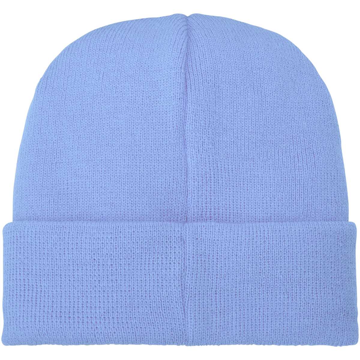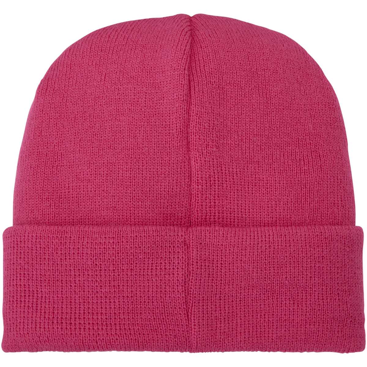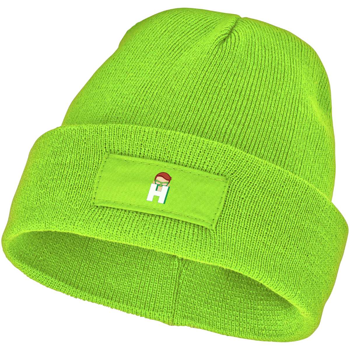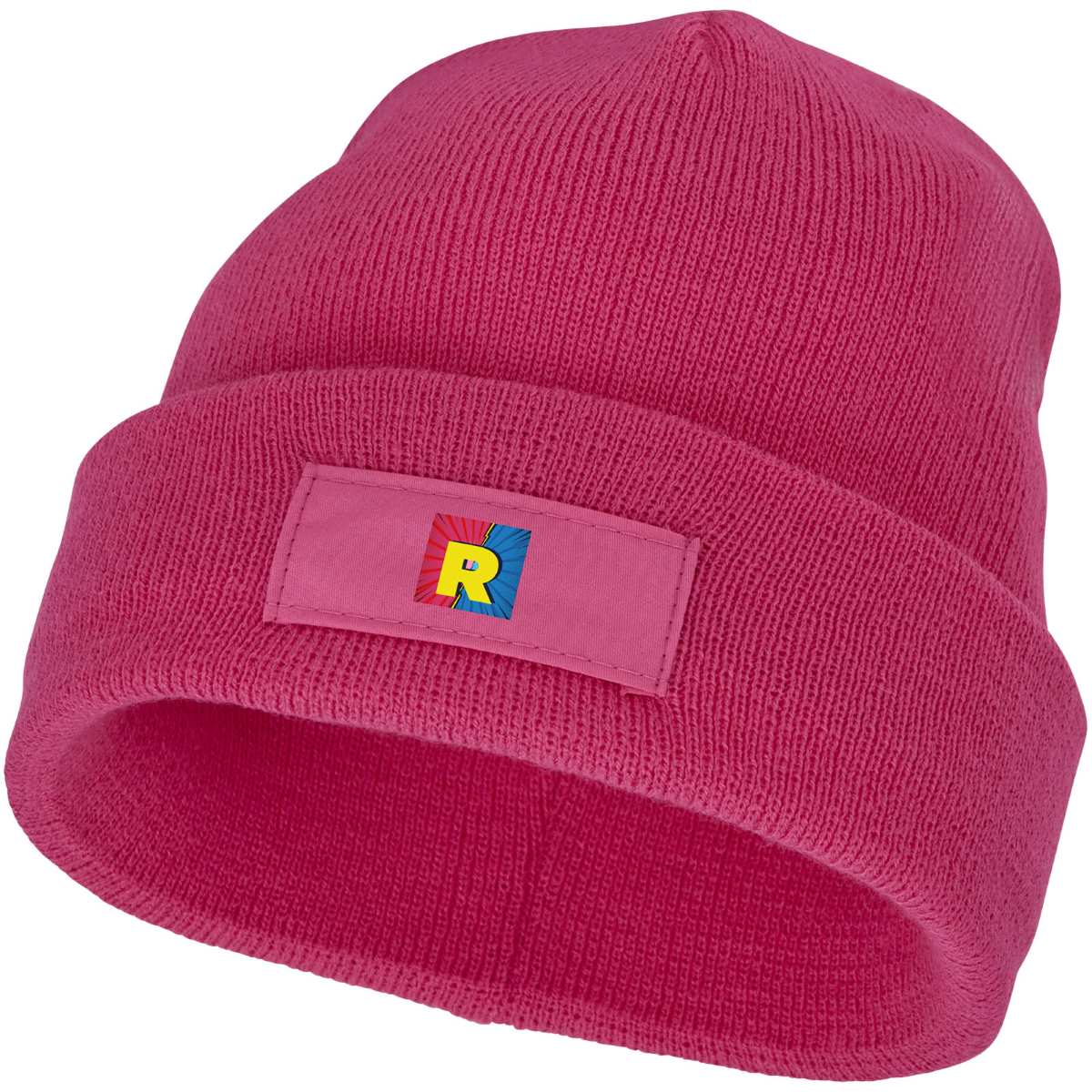 Yksikerroksinen pipo, kaksinkerroin käännetty reuna. Kangasmerkki logoa varten.