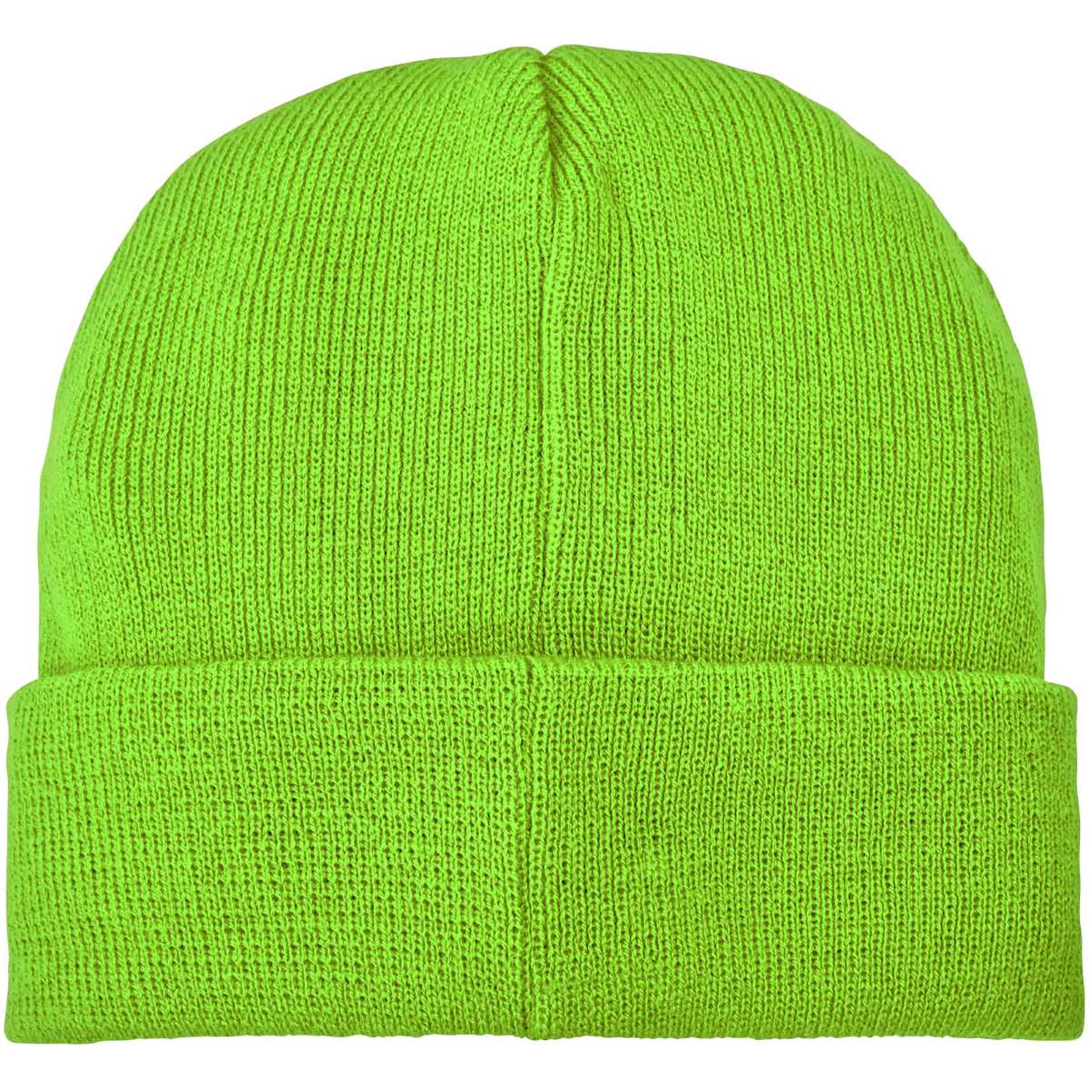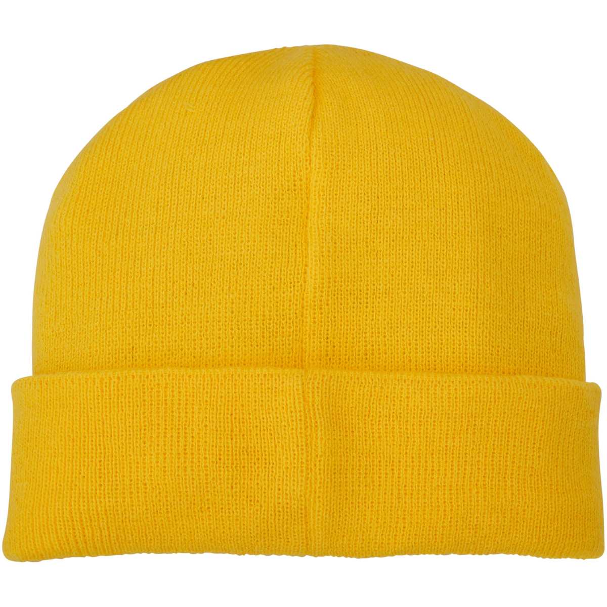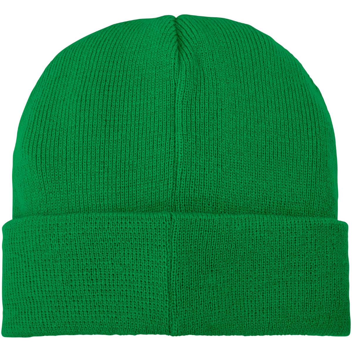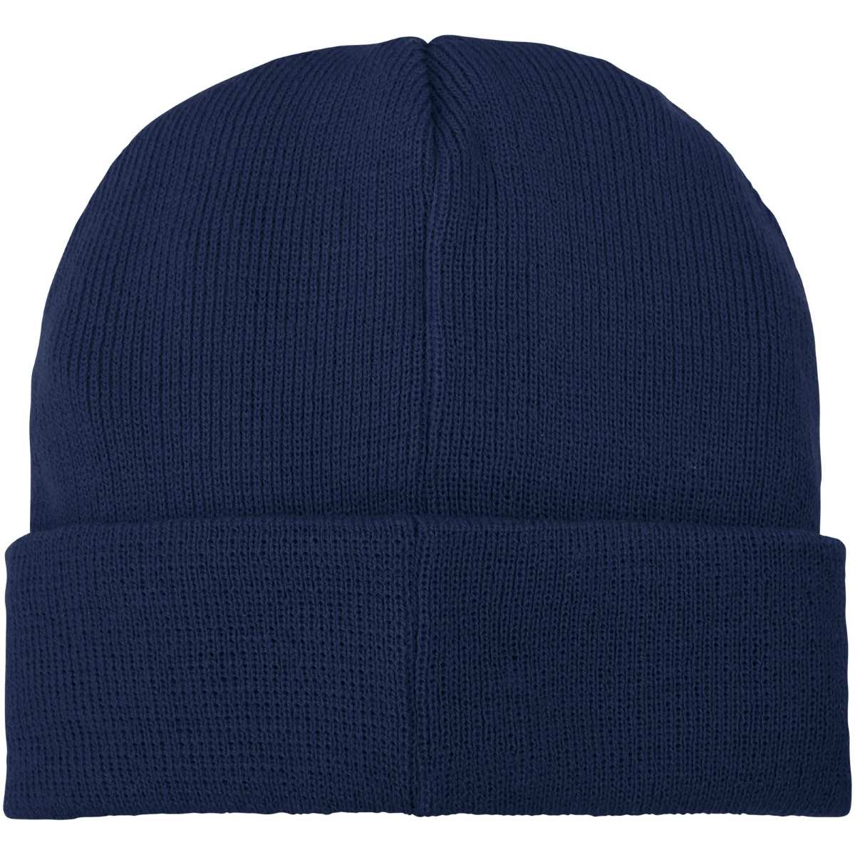 Yksikerroksinen pipo, kaksinkerroin käännetty reuna. Kangasmerkki logoa varten.