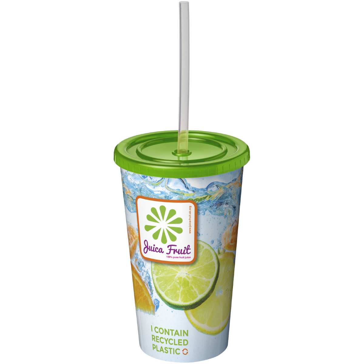 Kaksiseinäinen eristetty muki. Mukin ulkokerros on valmistettu kierrätysmuovista. Mukia ympäröi täysiväripainatus, joka on pitkäikäinen ja kestävä. Mukana PE pilli. Tilavuus on 350 ml. Valmistettu Isossa-Britanniassa. Pakattu kompostoituvaan pussiin. BPA-vapaa.