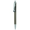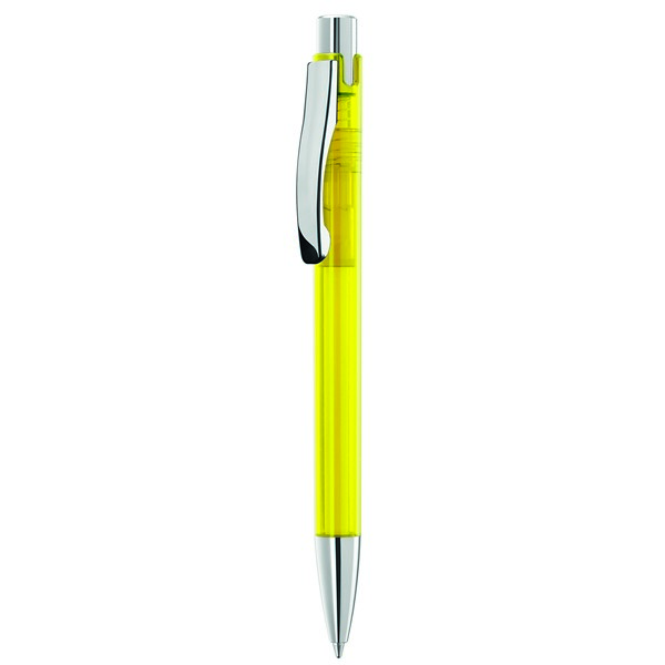 Tyylikäs kynä, jossa metallinen kärki ja läpikuultava värillinen runko.