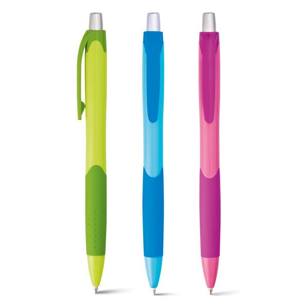 Kuulakärkikynä jossa sininen muste. Kuminen otekohta joka helpoittaa kirjoittamista. Klipsi on myös kumista materiaalia. Värivaihtoehtoina vaaleanpunainen, vaaleansininen tai vaaleanvihreä.