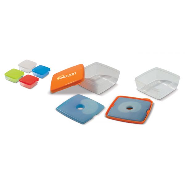 Kätevä eväsrasia, jonka kannessa on kylmävaraaja. Pakastettava varaaja pitää eväät viileänä pidempään.