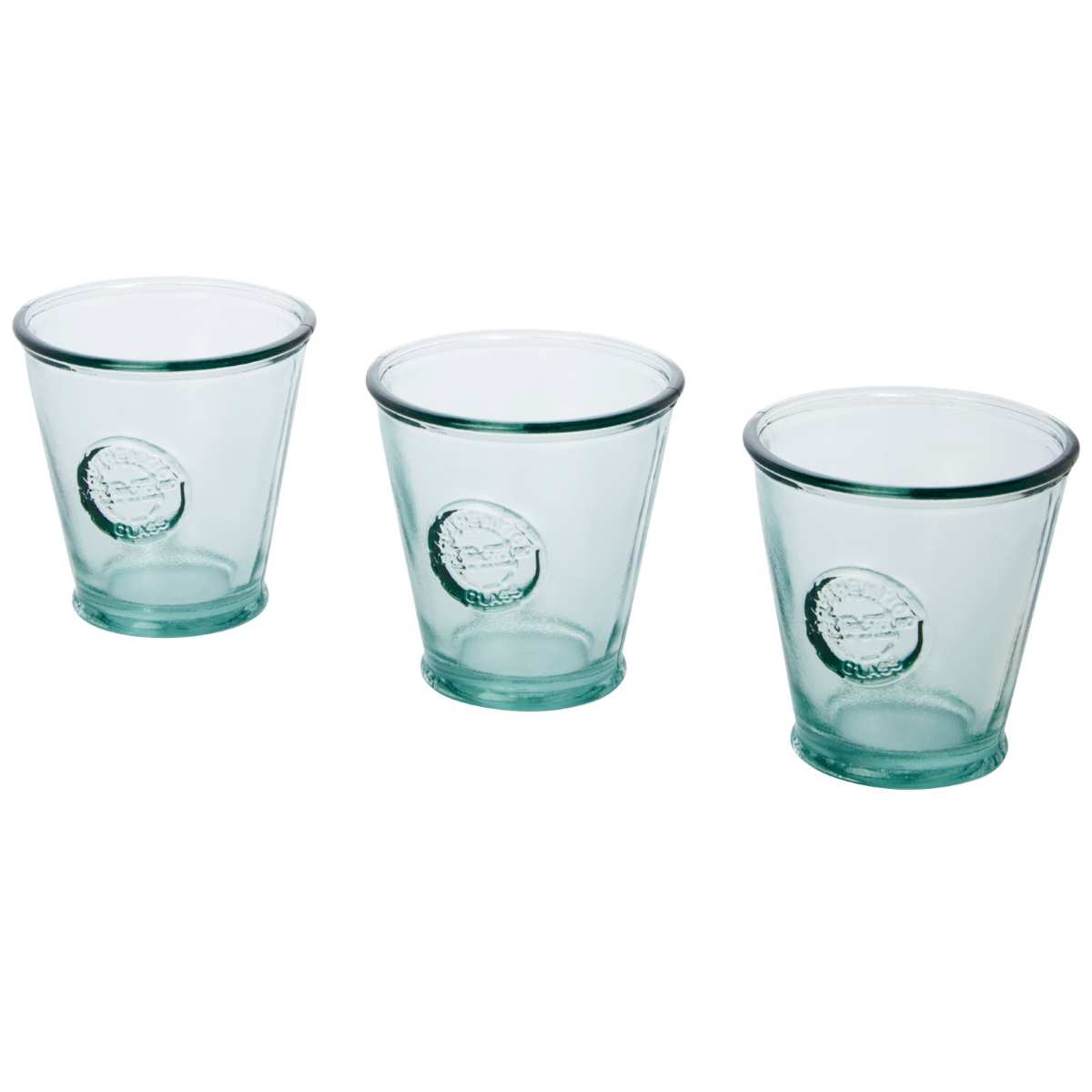 Kolmiosainen kierrätyslasista valmistettu setti, jossa kolme 250 ml:n juomalasia. Valmistettu yhdestä lasipullosta. Kierrätyslasi valmistetaan vähemmällä energialla, raaka-aineilla ja lisäaineilla kuin mitä perinteisen lasin valmistaminen edellyttää. Lasin koko: korkeus 9 cm, halkaisija 9 cm.
