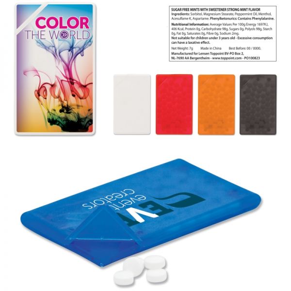 Piparmintturasia joka on saatavana viidessä eri mallissa. Valitse suosikkisi! Minttukaramellit ovat sokerittomia. Yksinkertaista, kaikki rasiat valokuvapainettuna samoilla hinnoilla.