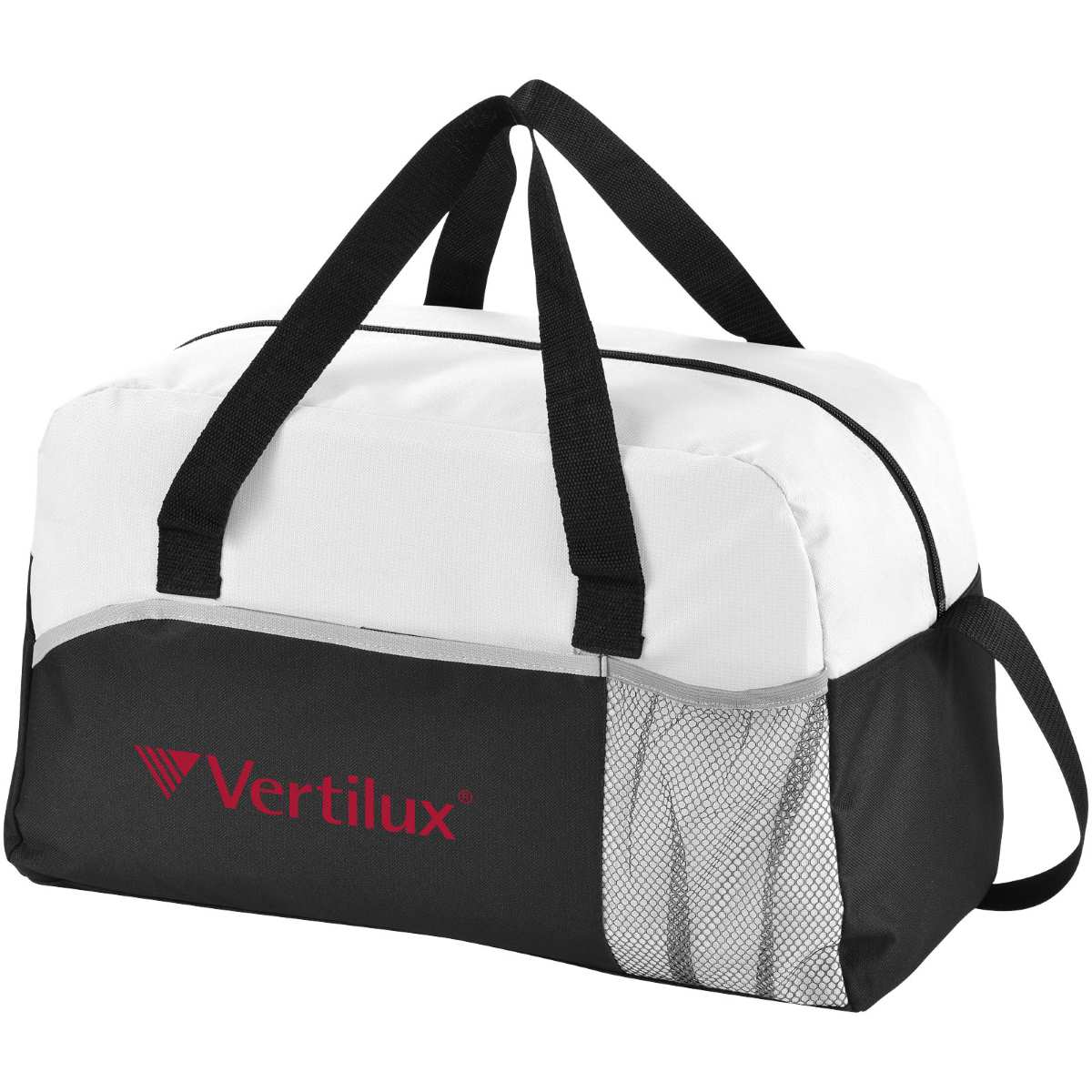 Vetoketjullinen säilytystasku. Etutaskussa velcro-tarranauha. Verkkotasku edessä. Kaksi vahvistettua kantokahvaa. Säädettävä olkahihna. Tarvikkeet rekvisiittaa.