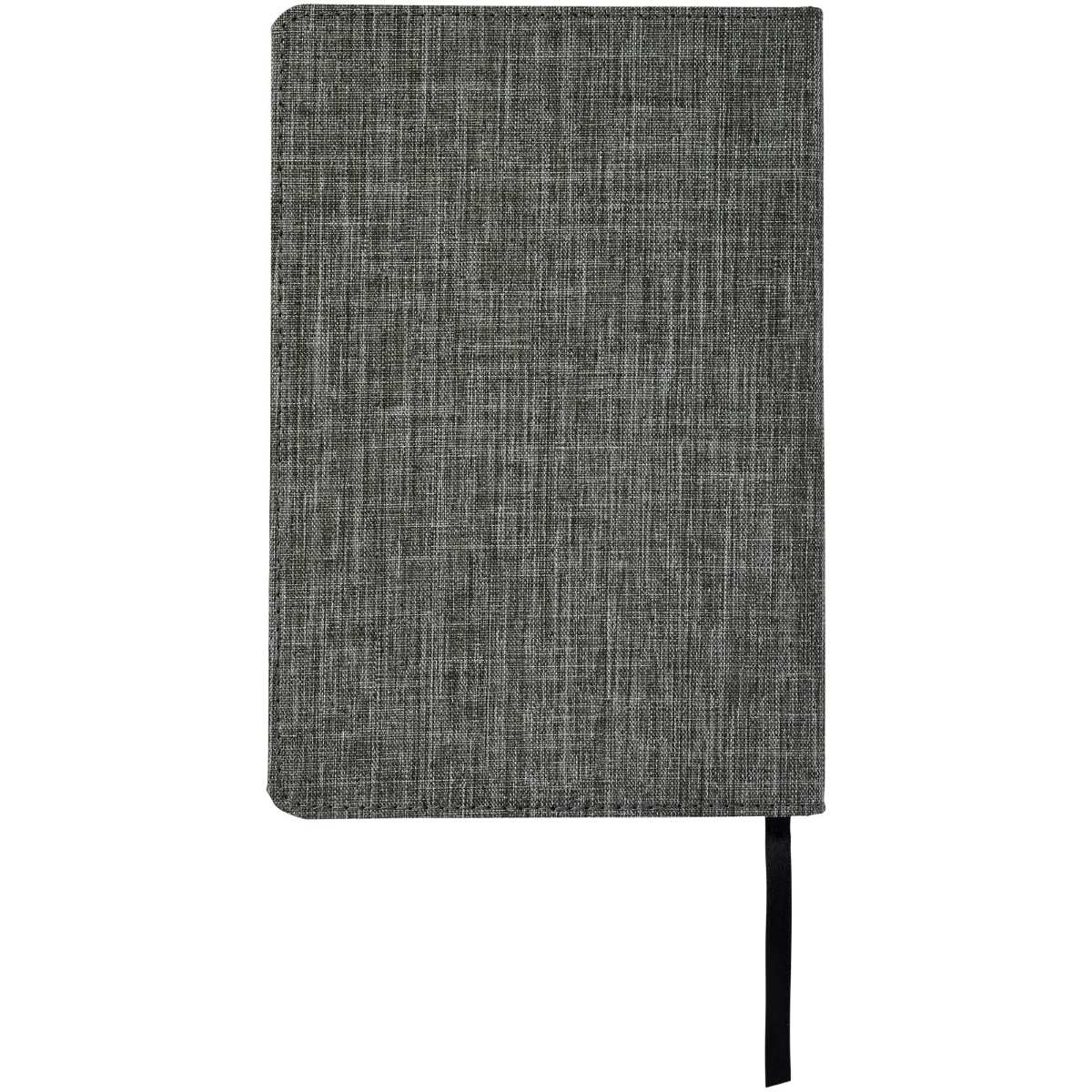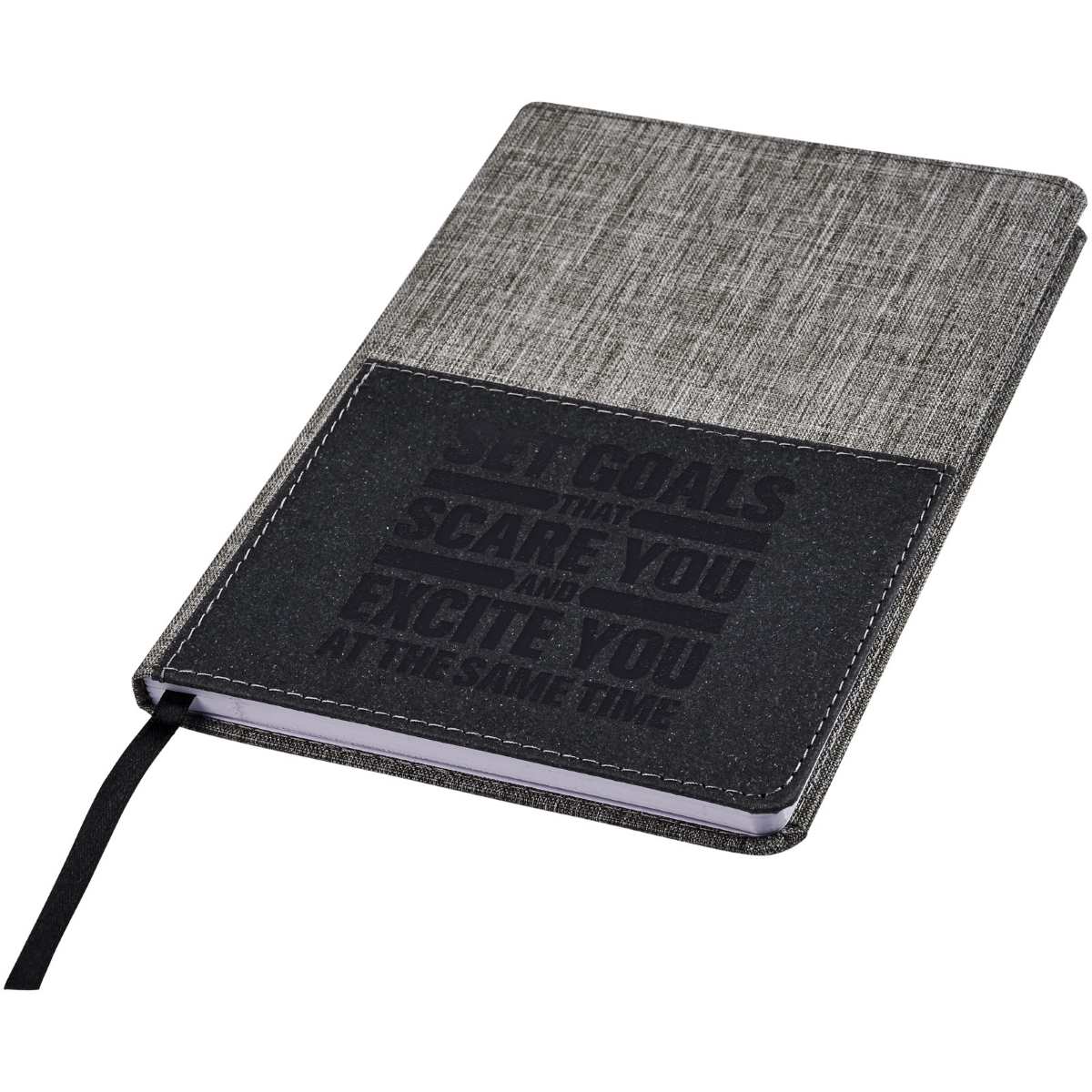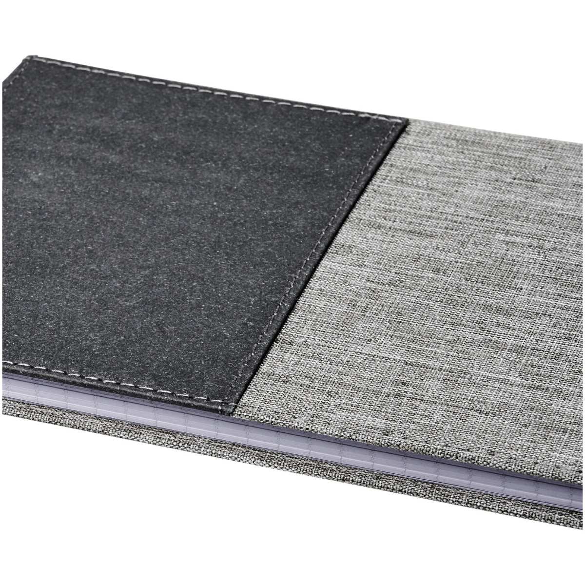 A5-kokoinen muistikirja, jossa harmahtava kansi, joka on valmistettu kierrätysmuoveista (70 %), kierrätetystä pahvista valmistetusta paperista (100 % kierrätettyä) ja etutasku, joka on valmistettu 100 %:sti ylijäämänahasta. Taskussa voi säilyttää älypuhelinta, kuulakärkikynää ja muita pieniä esineitä. Muistikirjassa on 80 kermanväristä viivallista 80 gsm sivua ja se on pakattu natural-väriseen suojapahviin.