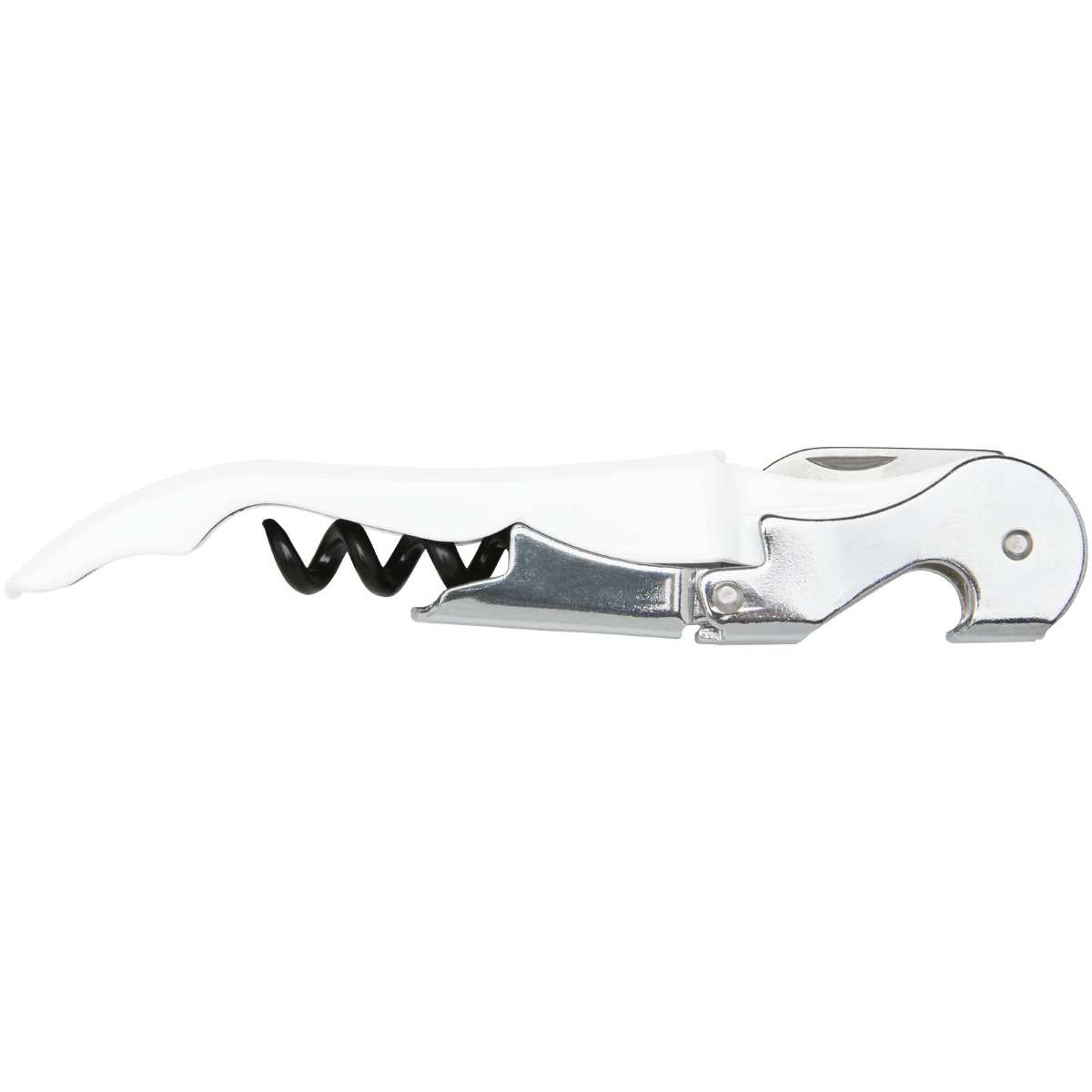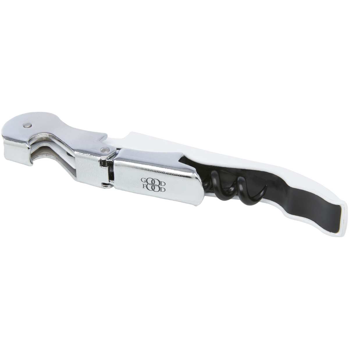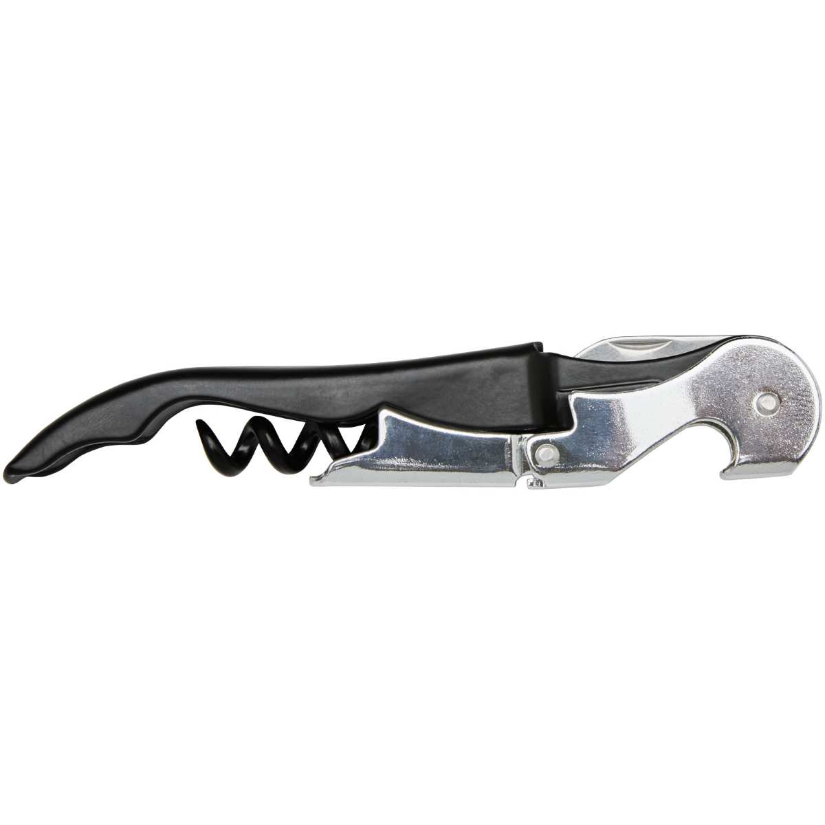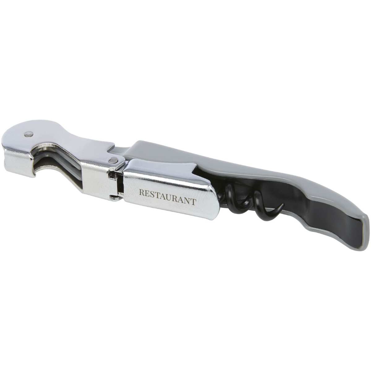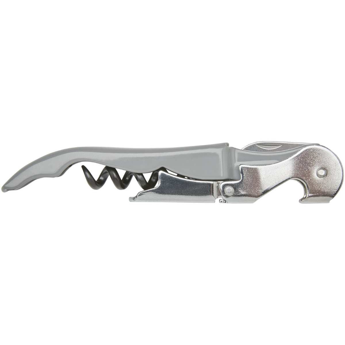 Ruostumattomasta teräksestä valmistettu tarjoilijan veitsi, joka on varustettu korkkiruuvilla, folioleikkurilla ja pullonavaajalla. Kaksiosaisen rakenteen ansiosta korkki on helppo vetää pullosta.