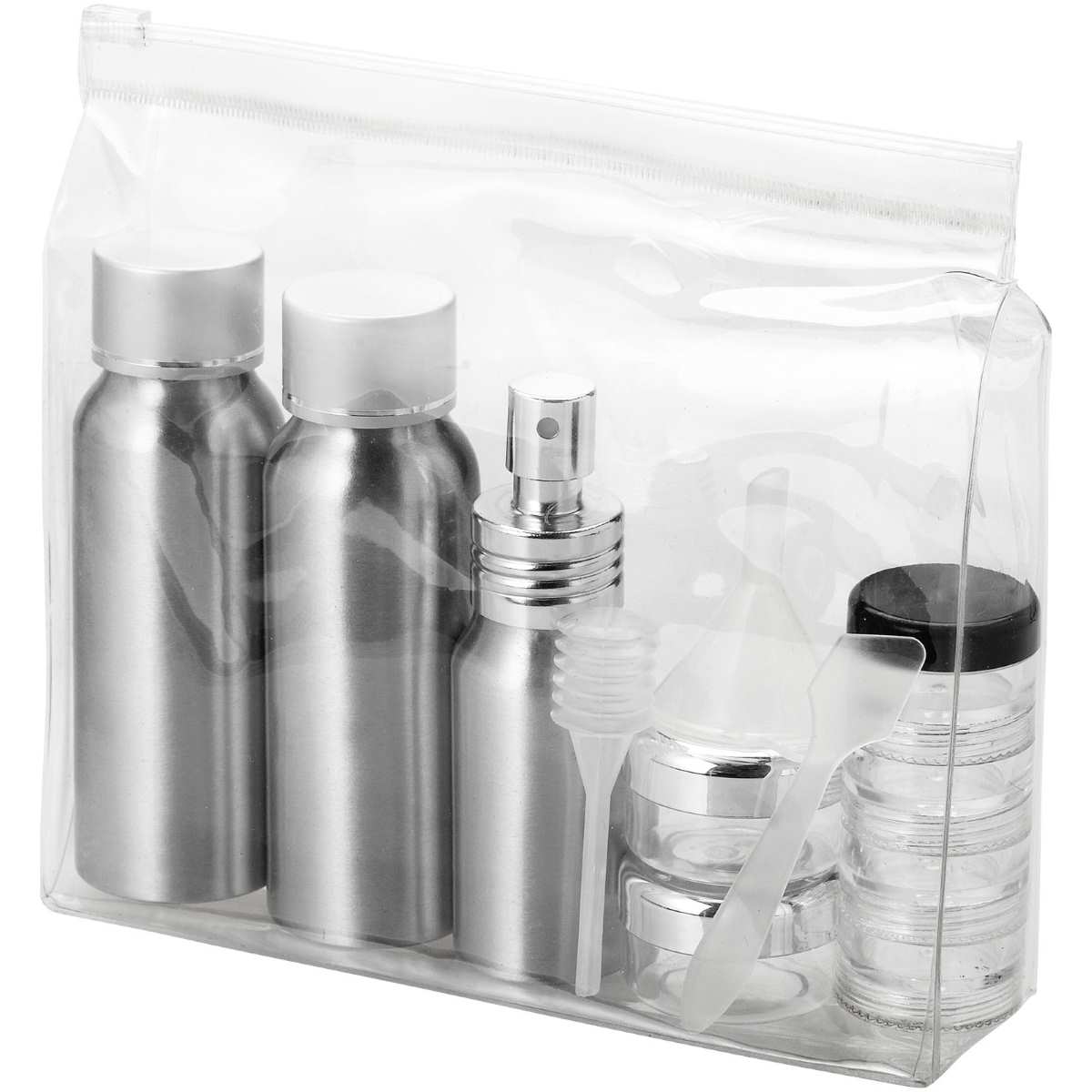 Sisältää 2 x 80 ml alumiinipulloa, 1 x 30 ml alumiinisuihkepulloa, 2 x 0,5 unssin purkkia, 1 x 4 kerrospurkkia, suppilon, lastan ja imupillin. Pullot, suppilo ja muut tarvikkeet on pakattu muovipussiin. Toimitetaan erikseen pussissa. Painatus ei mahdollinen eri osiin.