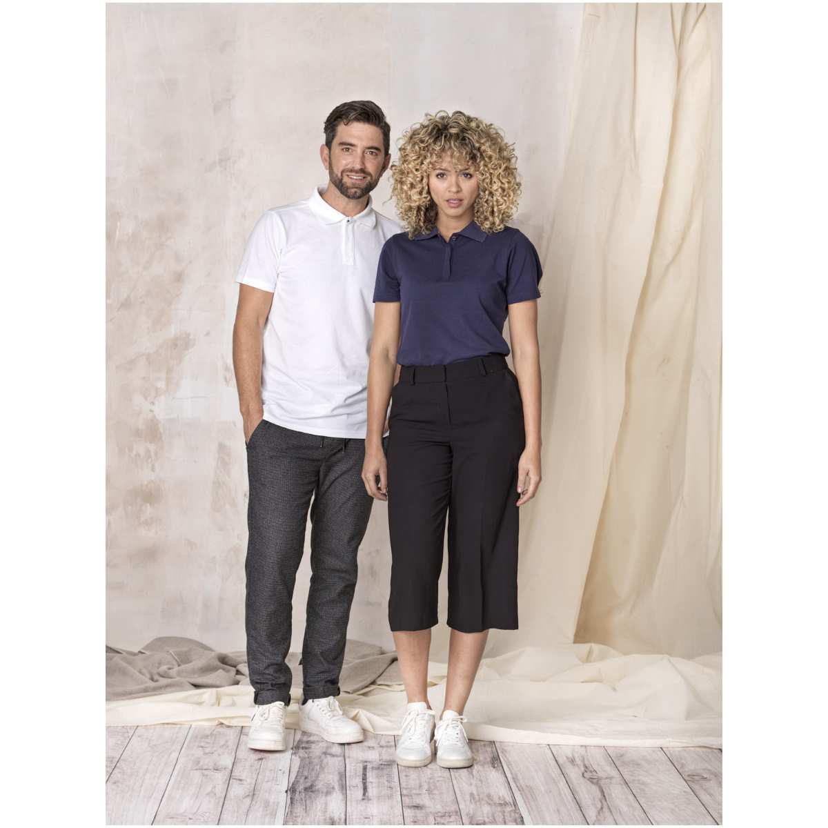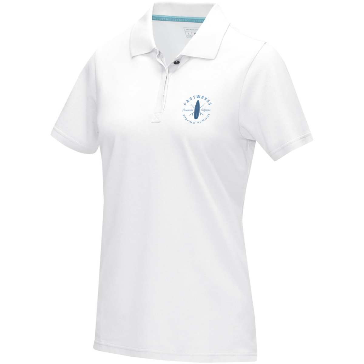 Kestävän kehityksen myynninedistämisvaatteet. Ympäristöystävälliset metallinapit. Piilotettu neljän napin napituslista. Neulekaulukset. Kapeneva vyötärö parantaa istuvuutta. Kaksivärinen merkkikaulanauha. Sivuhalkiot, joissa kaksivärinen merkkiteippiviimeistely. Puolikuumuoto. Lämpösiirrettävä merkintä takaa käyttömukavuuden ilman lappuja.