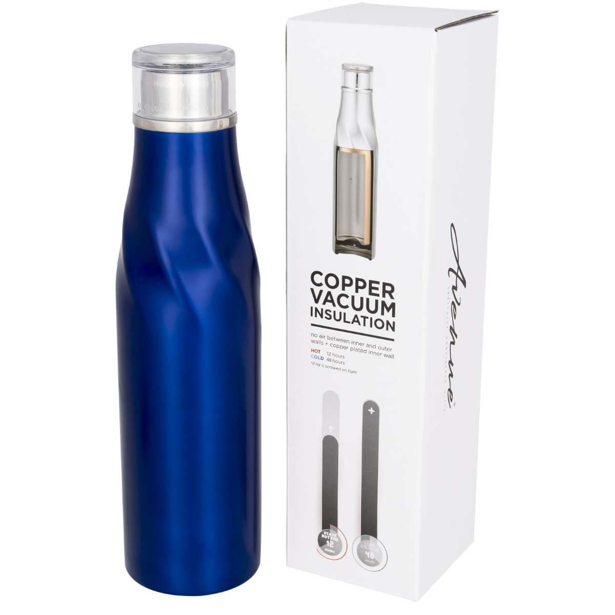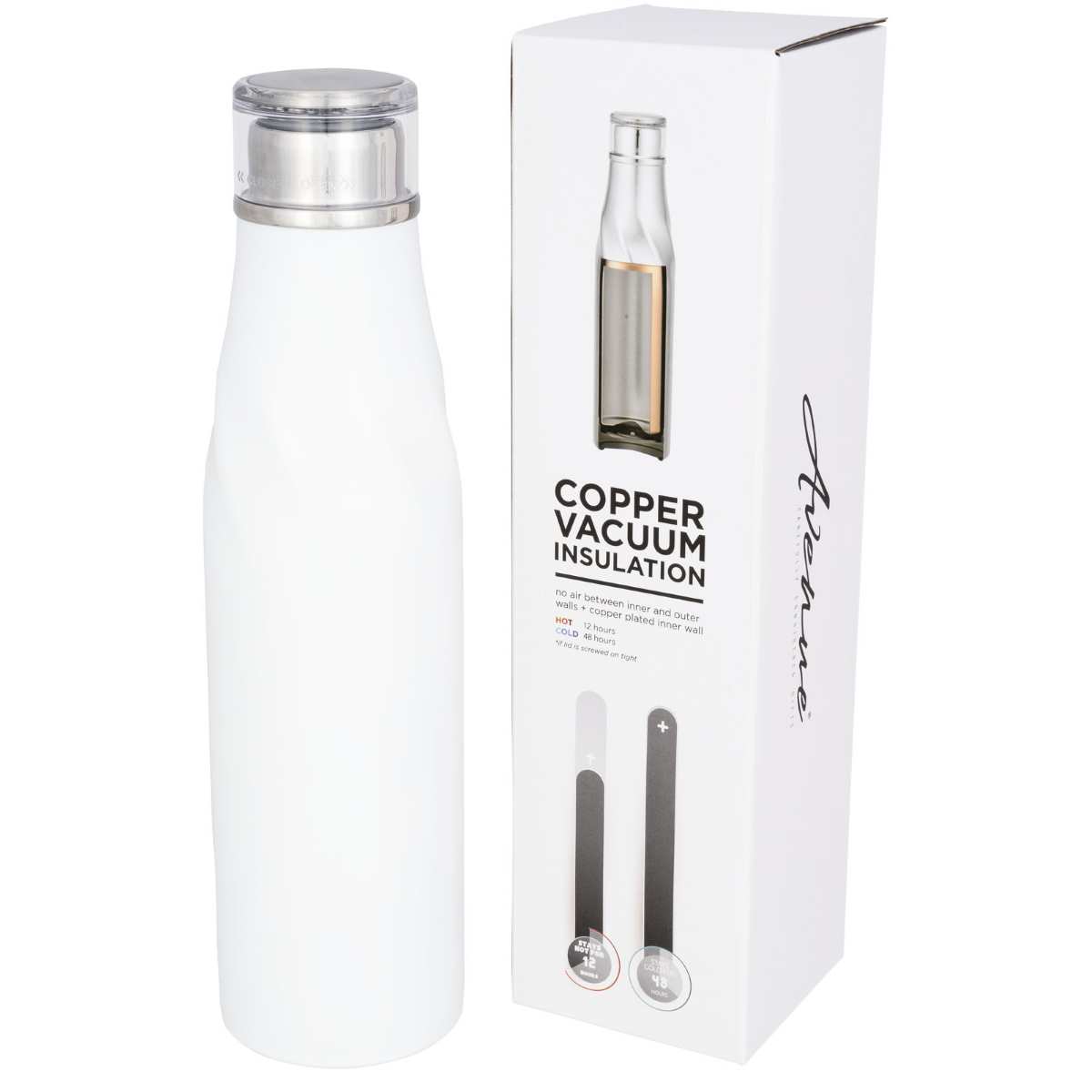 Muotoiluun kuuluu itsesulkeutuva ominaisuus, joka takaa helpon avaamisen sekä mukavamman juomiskokemuksen. Leveä aukko helppoon täyttämiseen ja kaatamiseen. Kestävä, kaksinkertainen tyhjiörakenne ruostumattomasta teräksestä kuparieristyksellä, jonka avulla juoma pysyy kuumana 12 tunnin ajan ja kylmänä 48 tunnin ajan, ja siihen kuuluu itsesulkeutuva kansi joka suojaa läikkymiseltä. Tilavuus on 650ml. Avenue-lahjapakkaus.