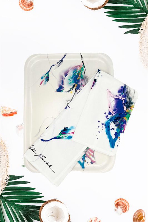 Jukka Rintalan Blue Moment-kuosi Non-Slip tarjottimena ja keittiöpyyhkeenä. Pakattu lahjapakkaukseen.