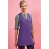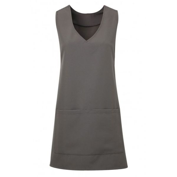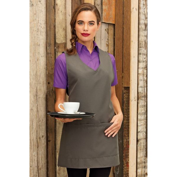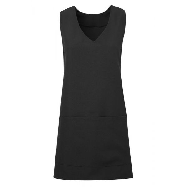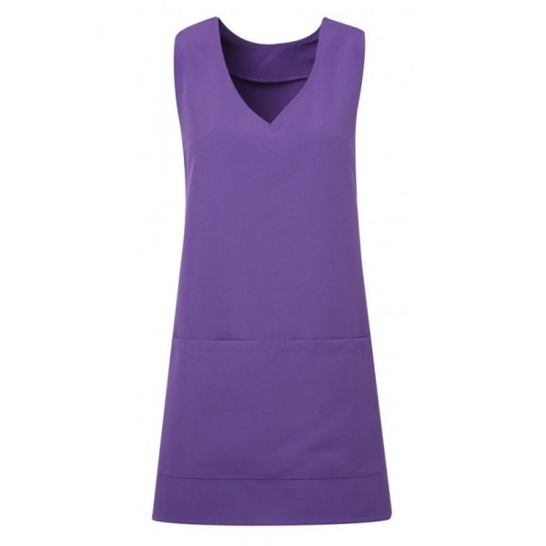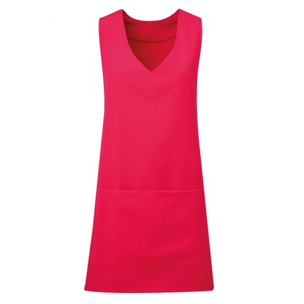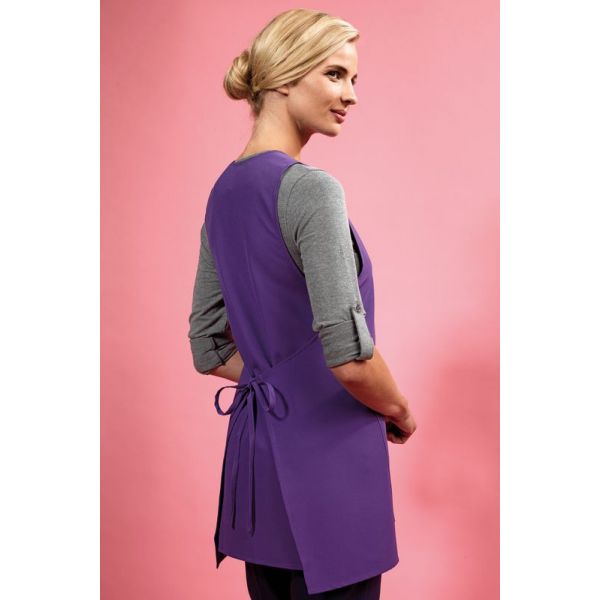 V-aukkoinen, pään yli puettava malli. Sidotaan nauhoilla etukappaleelta taakse. Tunikan etupuolella tasku.
