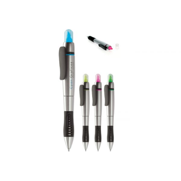 Yhdistetty korostus- ja kuulakynä, jossa hopeanvärinen runko mustilla osilla.