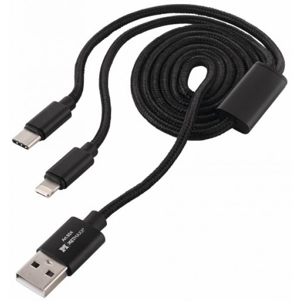 Latauskaapeli kaikille matkapuhelimille. Yhdessä plugissa USB, Micro USB, Apple Lightning ja USB-C. Tuotteen mukana tulee myös adapteri.