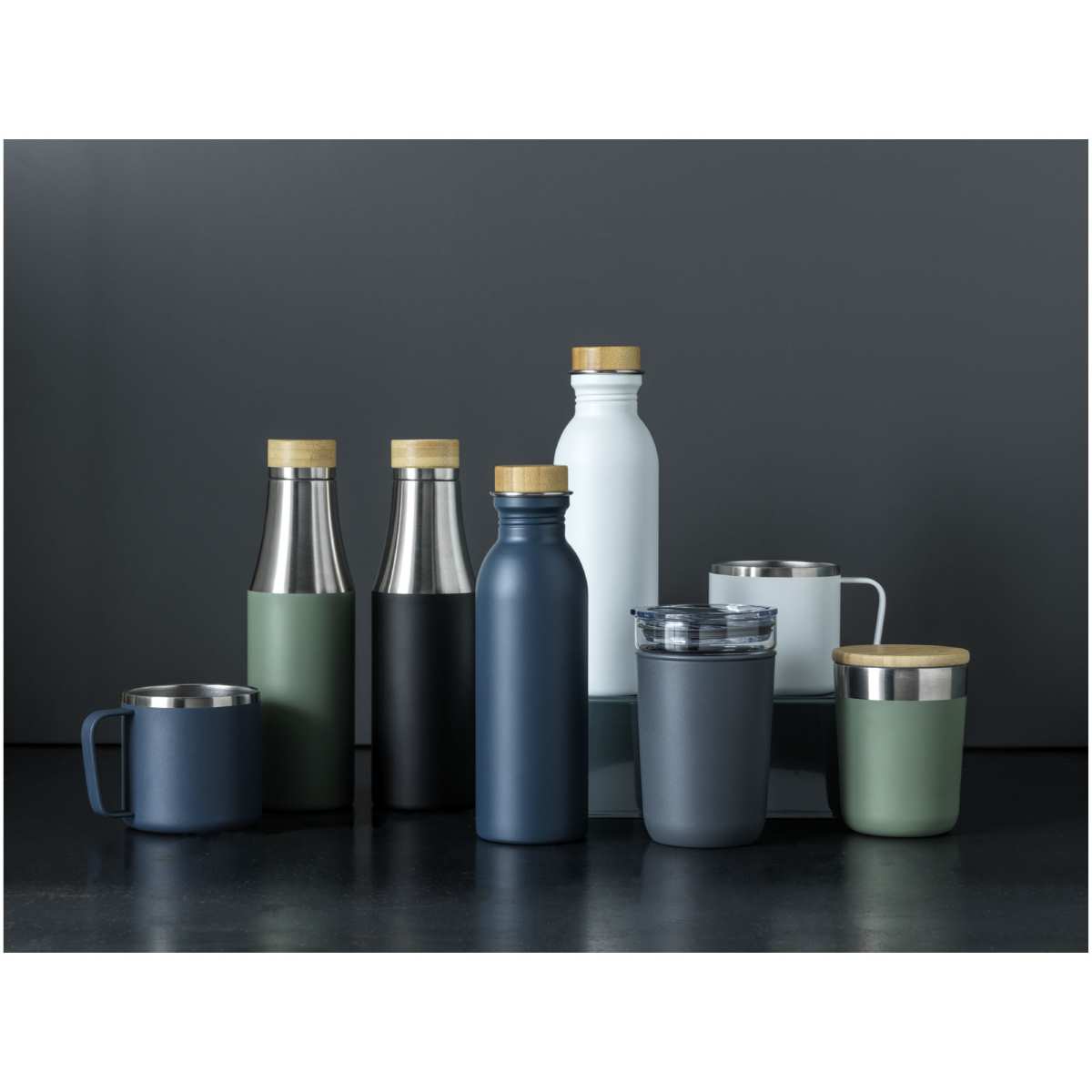 Kaksiseinäinen kuparivakuumieristetty kahvimuki, moderni kansi, orgaanisesta bambusta valmistettu kansi. Eristetty 18/8 ruostumaton teräs pitää juoman kuumana tai kylmänä useita tunteja. BPA-vapaa, testattu ja hyväksytty elintarviketurvallisuuslainsäädännön (LFGB) mukaisesti, sekä ftalaattipitoisuus testattu REACH-asetusten mukaisesti. Sopii useimpien kahvinkeittimien alle, joten se on täydellinen kahvimuki työskentelyyn tien päällä. Tilavuus on 300 ml. Toimitetaan kierrätetystä kartongista valmistetussa lahjapakkauksessa. Suositellaan pestäväksi käsin.