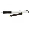 Valkoinen metallikynä metallisella klipsillä ja sinisellä musteella.