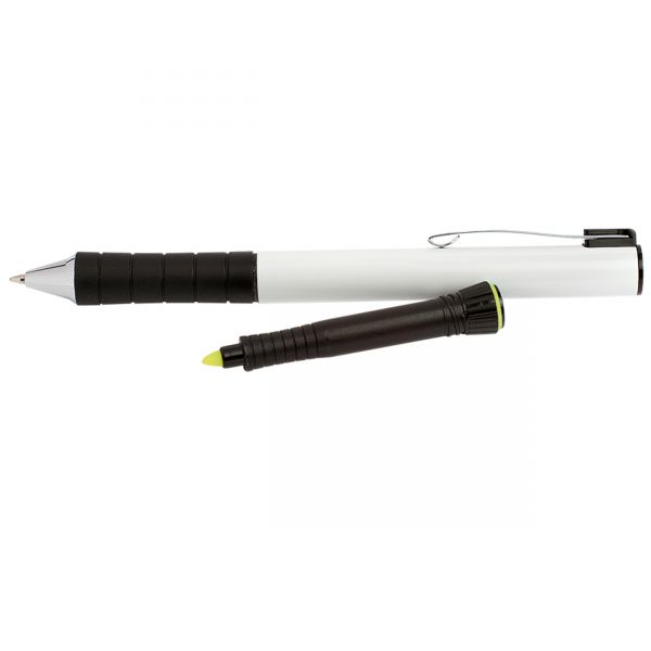 Kynän yläosassa keltainen tussi, joka saadaan tarpeen vaatiessa helposti esille.