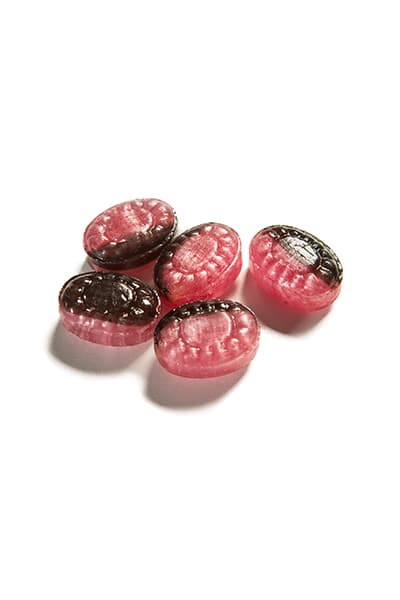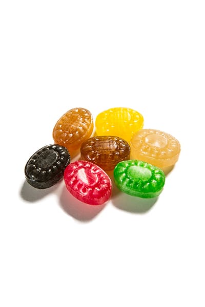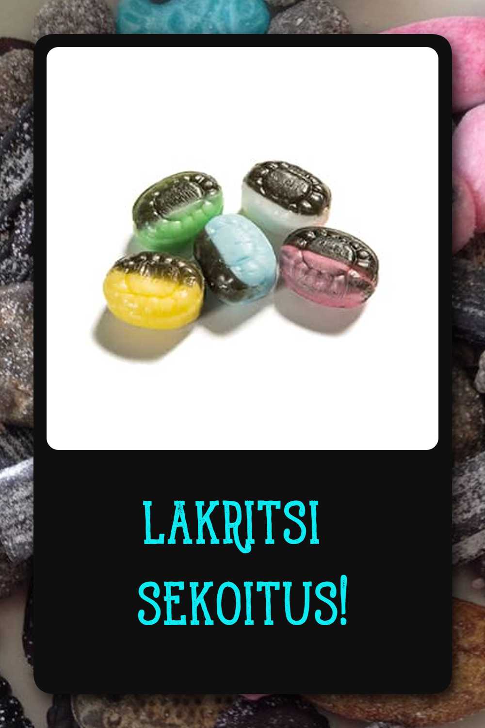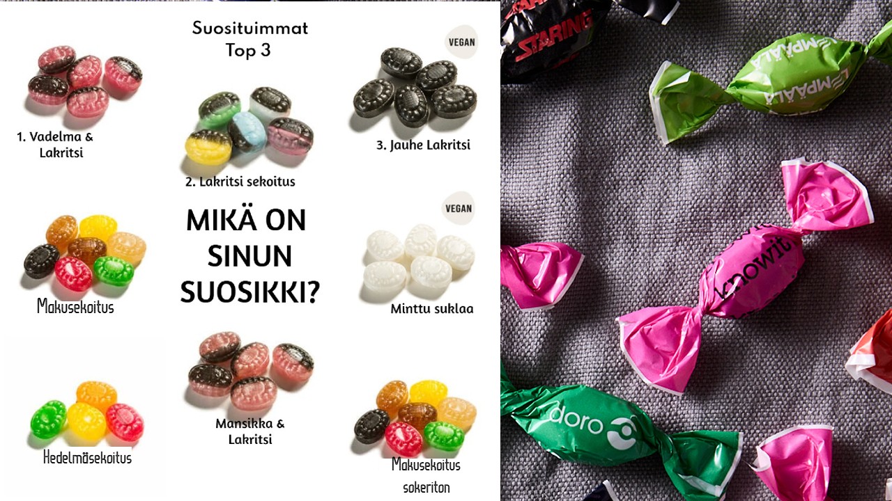 3. Lakritsisekoitus (kaksiväriset makeiset, joissa lakritsi yhdistettynä hedelmäisiin makuihin, sisällä lakritsijauhetta)