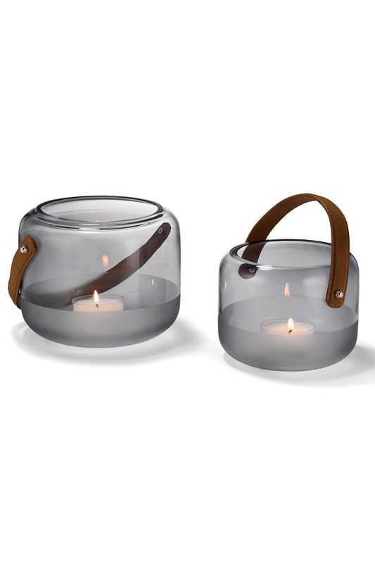 Korkealaatuinen suupuhallettu lasilyhty, jossa tyylikäs nahkainen kahva.