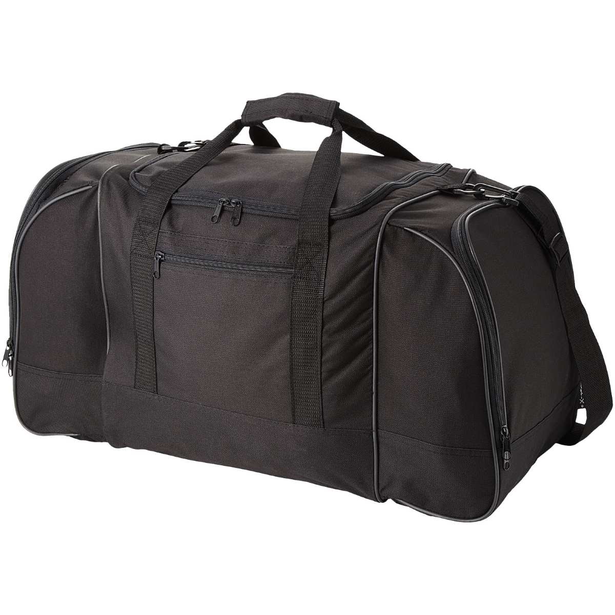 Matkakassi sopii myös urheiluvälineille. Vetoketjullinen säilytystasku ja sivulla 2 vetoketjullista taskua.