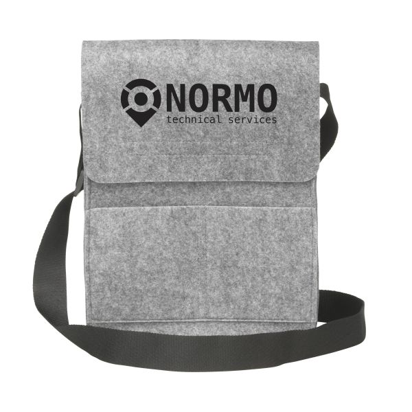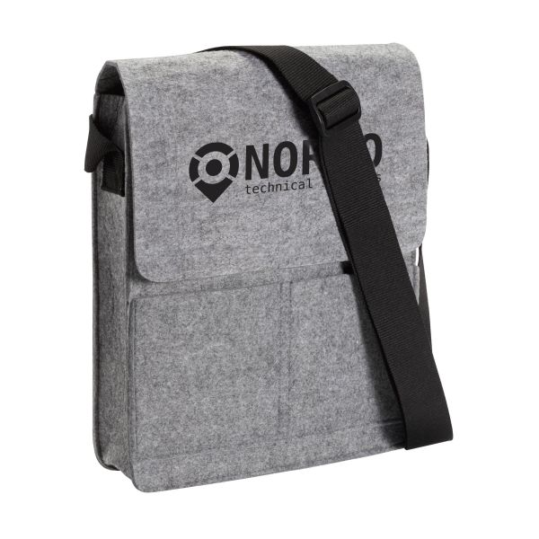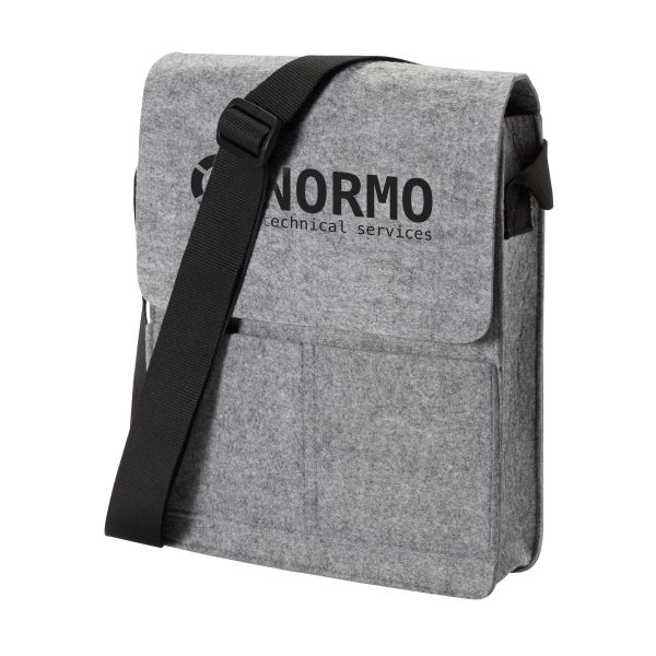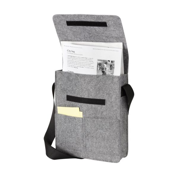 3 mm paksuisesta huovasta valmistettu olkalaukku, jossa on tarraläppäkiinnitys, 2 taskua ja säädettävä olkahihna.