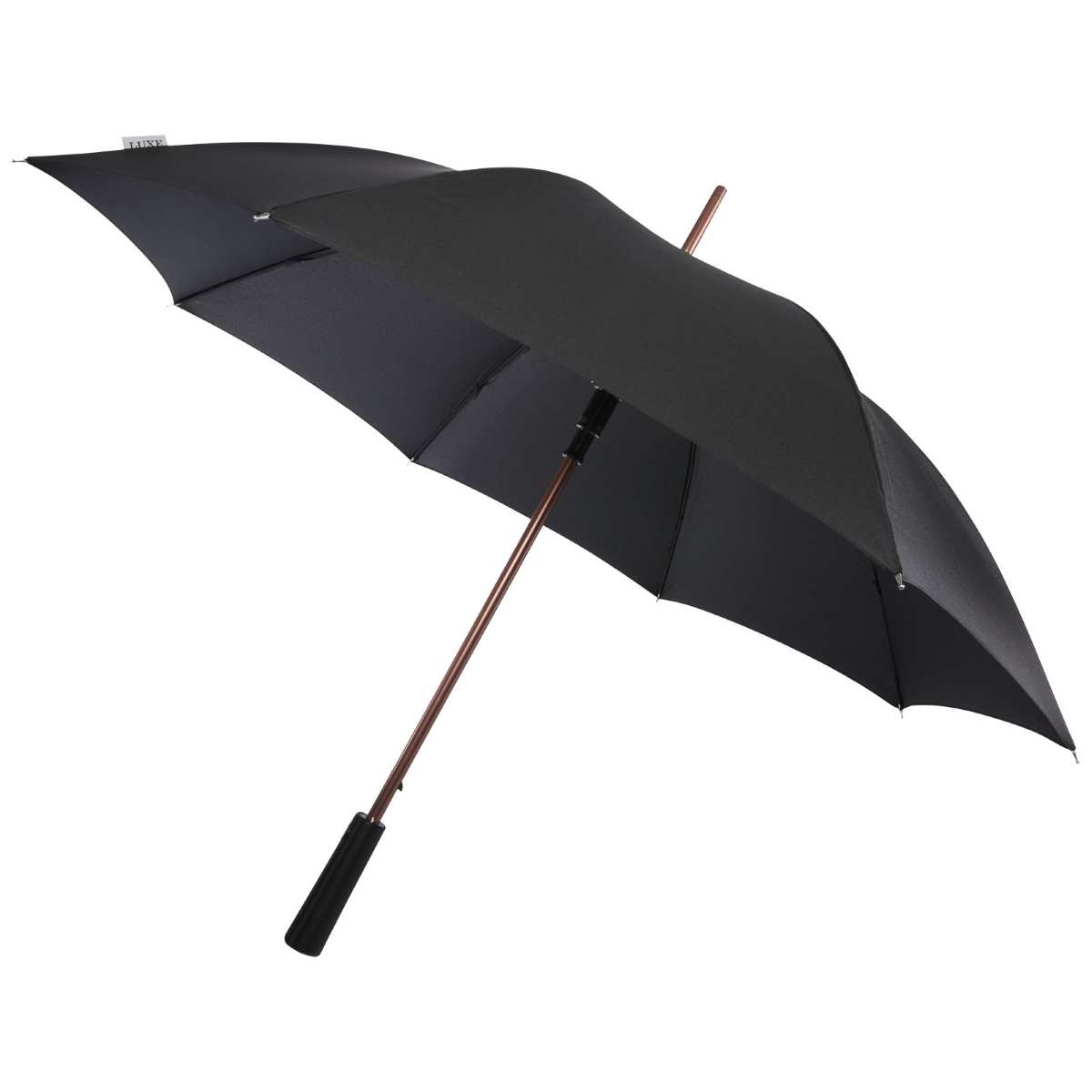 Automaattisesti avautuva sateenvarjo, jossa on musta pongee-polyesterikupu. Korkealaatuisesti viimeistelty tukeva alumiinivarsi. Laadukas lasikuitukehikko joustaa erinomaisesti tuulisissa olosuhteissa. Pehmeä suora kahva. Luxe-merkit kuvussa ja suljentanauhassa. Suuri logomerkintäalue jokaisessa paneelissa.