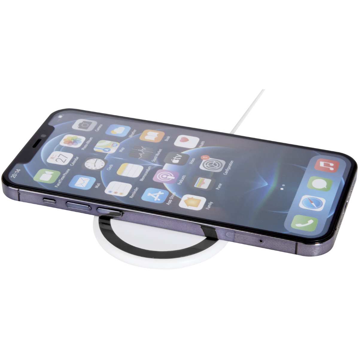 Langaton magneettinen latausalusta, joka voidaan kiinnittää puhelimen takaosaan (iPhone 12 /iPhone 12 Pro /iPhone 12 Pro MAX) sen lataamiseksi. Tämä 10 W:n langaton laturi on yhteensopiva kaikkien Qi -laitteiden kanssa (iPhone 8 tai uudempi ja Android -laitteet, jotka tukevat langatonta latausta), ja muissa puhelimissa sitä voidaan käyttää tavallisena langattomana latausalustana. Mukana tulee ylimääräinen kaksinkertaisella teipillä varustettu metallirengas, jotta tuote on yhteensopiva muiden älypuhelimien kanssa, joissa on langaton latausmahdollisuus. Toimitetaan lahjapaketissa käyttöohjeen kanssa.