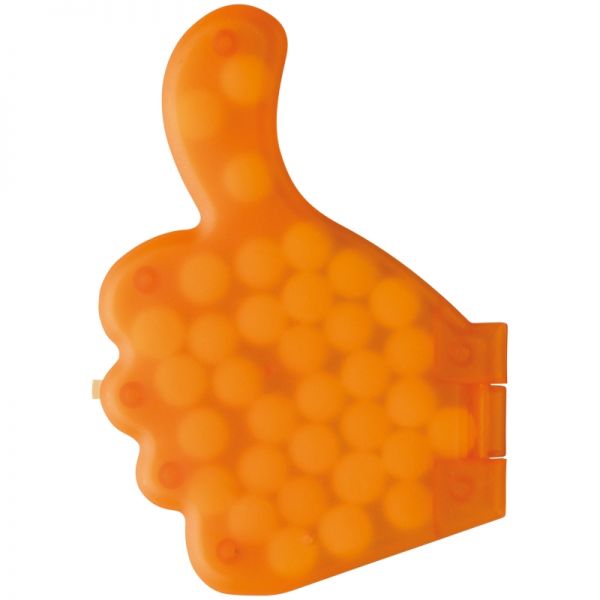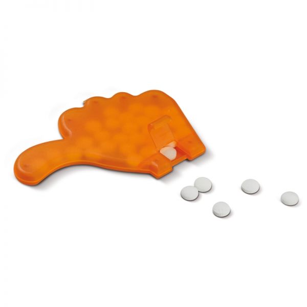 Peukalonmuotoinen minttukarkkirasia (sokeriton). Rasia aukeaa ranteesta. Soveltuu digitaaliseen väripainatukseen.