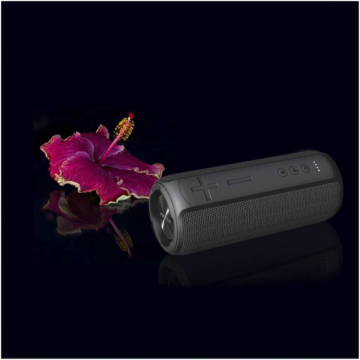 Bluetooth 4.2 IPX7 roiskeveden kestävä 30 W kaiutin, mikrofoni ja hands-free toiminto puhelujen vastaanottamiseksi. 2200 mAh akku joka latautuu täyteen 3 tunnissa, soittoaika 10 tuntia. Koko 9.4 x 9 x 11 cm. Paino 380 g.