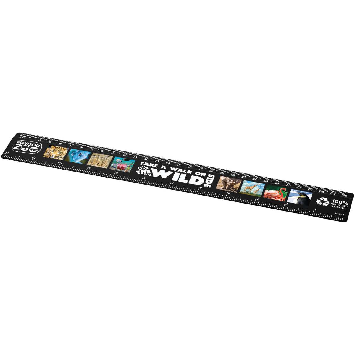 Tukeva kierrätysmuovinen viivain, johon on merkitty tuumat ja senttimetrit.
