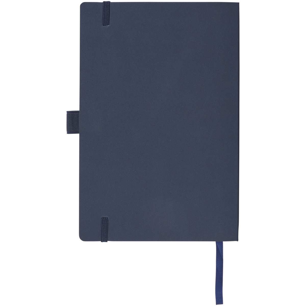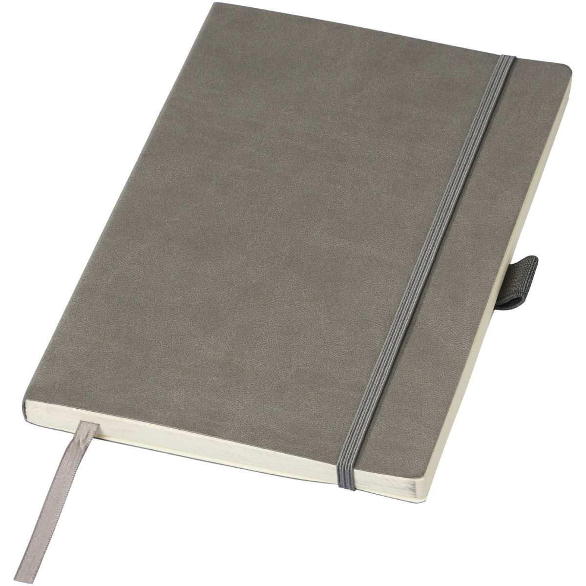 Joustava pehmeäkantinen muistikirja (A5-koko) elastisella sulkimella, nauhamerkillä, kynäsilmukalla ja asiakirjatasku takaosan sisäpuolella ja 80 arkkia (80gsm) kermanväristä viivallista paperia. Pakattu mustaan pussukkaan.