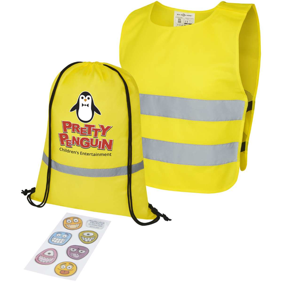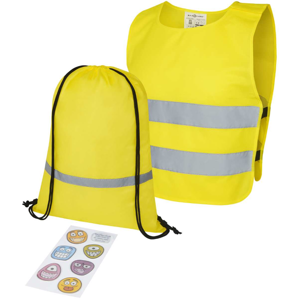 Täydellinen turvallisuus- ja näkyvyyssetti 3–6-vuotiaille lapsille. Tämä lasten lahjapaketti sisältää heijastavan repun kiristysnyörillä, turvaliivin ja 6 kpl hauskoja heijastintarroja. Heijastava reppu on kiristysnyörillä suljettava ja se on testattu ja sertifioitu asetuksen EN 1150:1999 mukaisesti. Erittäin näkyvä XXS-kokoinen turvaliivi sopii 3–6-vuotiaille, joiden pituus on 70–104 cm. Liivin etu- ja takaosassa on suuri logomerkintäalue. Hartialinjan ja alareunan kuminauhoissa on tarranauhakiinnitys, joka lisää turvallisuutta ja helpottaa liivin pukemista. Liivi venyy toisella puolella olevien kuminauhojen ansiosta, joten sitä voi pitää paksunkin takin päällä. Liivi on testattu ja sertifioitu EN 1150:1999 -asetuksen mukaisesti. Se noudattaa myös henkilösuojaimiin liittyviä ohjeita, jotka koskevat (EU) 2016/425 -asetuksen soveltamista luokan II henkilökohtaisiin suojaimiin. Heijastintarrat voidaan kiinnittää reppuun, pyörään tai pyöräilykypärään. Heijastintarrat ovat standardin EN 13356: 2001 mukaisia ja standardin EN 13356: 2001 tyypin 3 mukaan sertifioituja.