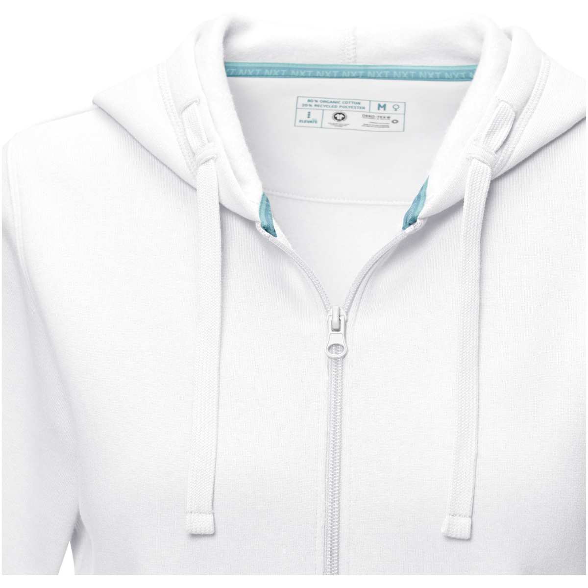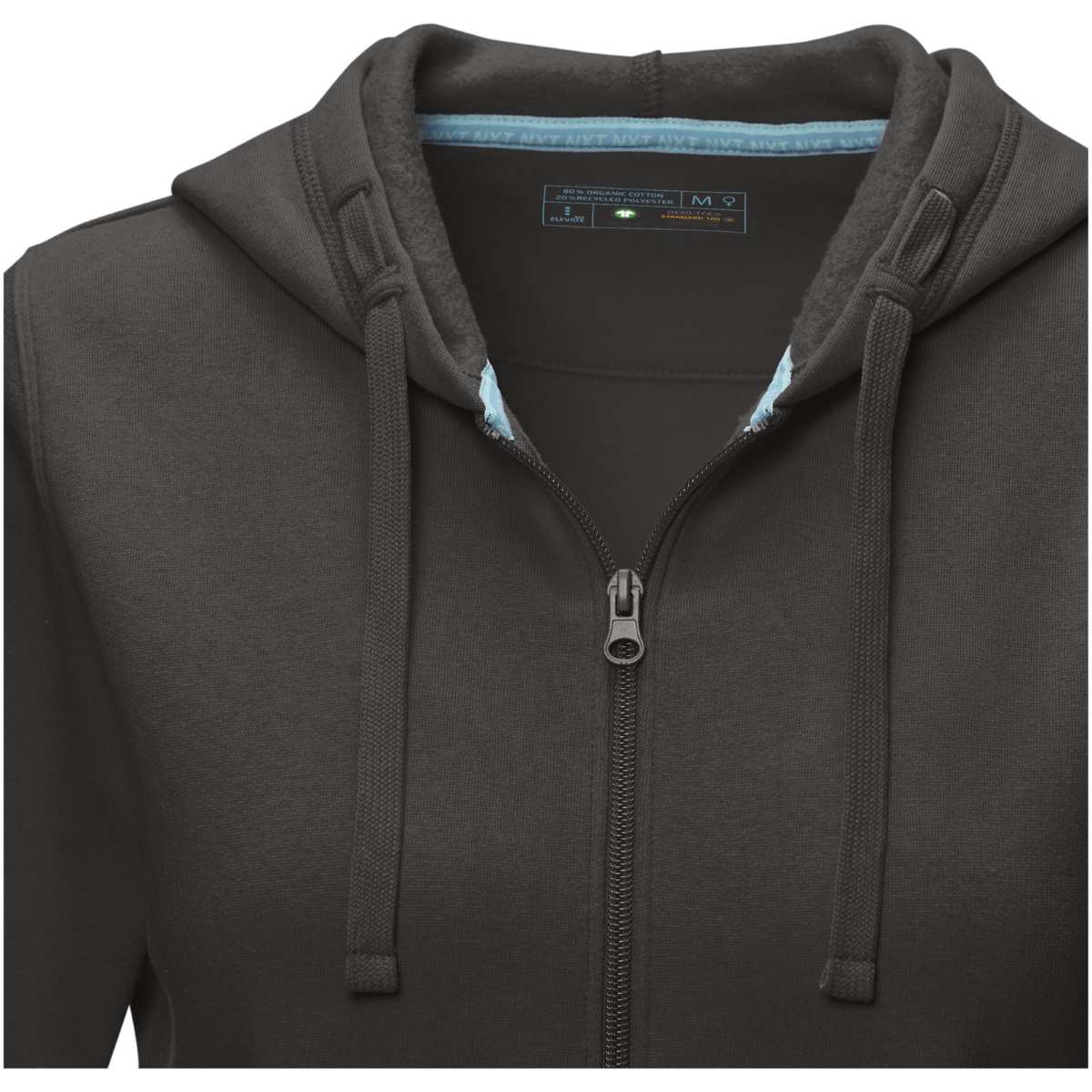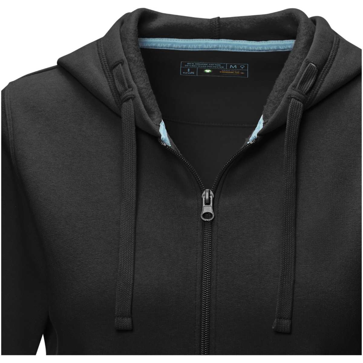 Kestävän kehityksen myynninedistämisvaatteet. Edessä keskellä GRS-sertifioitu vetoketju. Hupussa on GOTS-sertifioitu kiristysnyöri. Kapeneva vyötärö parantaa istuvuutta. Kengurutasku. Harjattu sisäpuoli. Neuleresorit. Neuleresorien alareuna. Kaksivärinen merkkikaulanauha. Puolikuumuoto. Lämpösiirrettävä merkintä takaa käyttömukavuuden ilman lappuja.