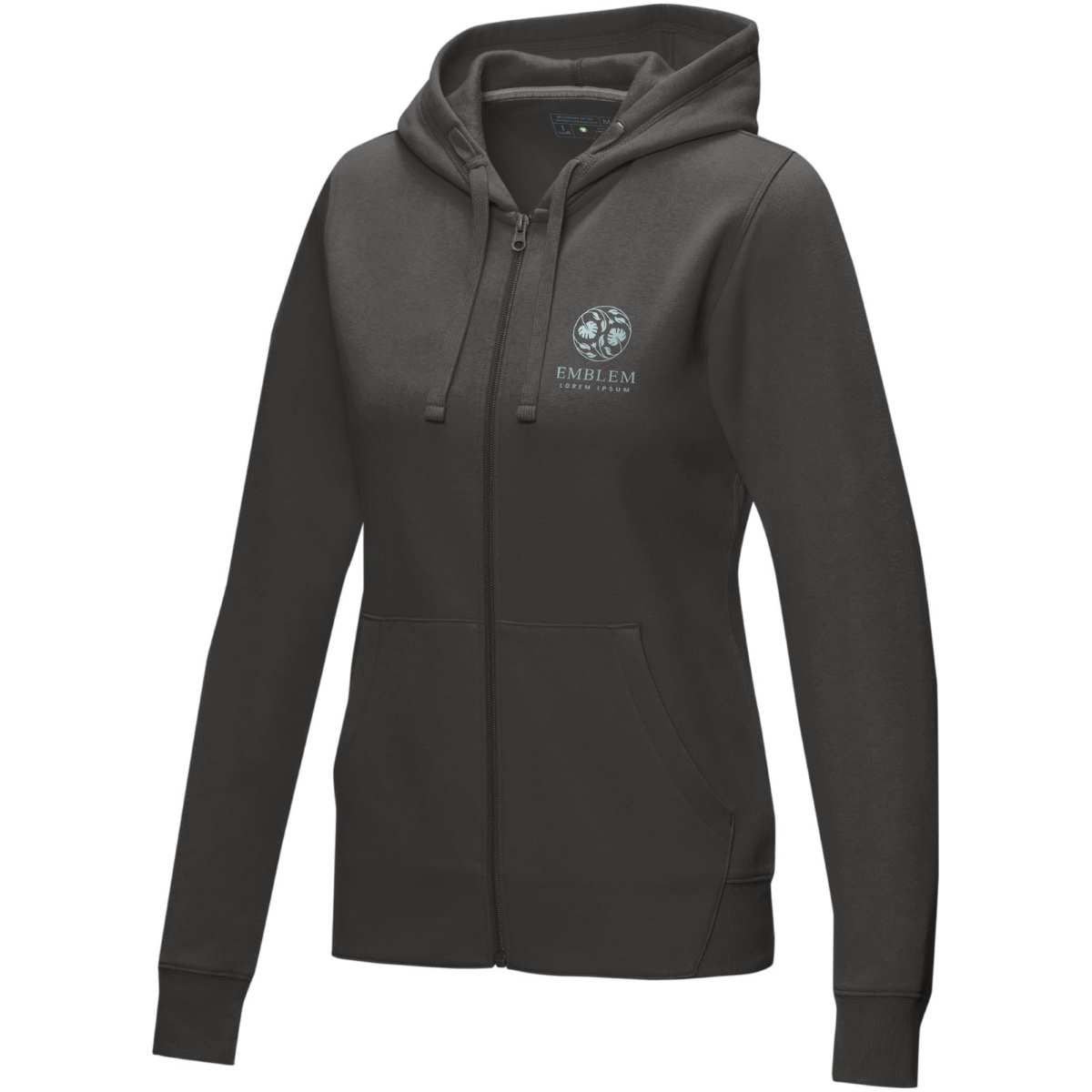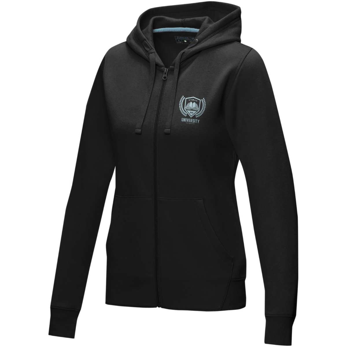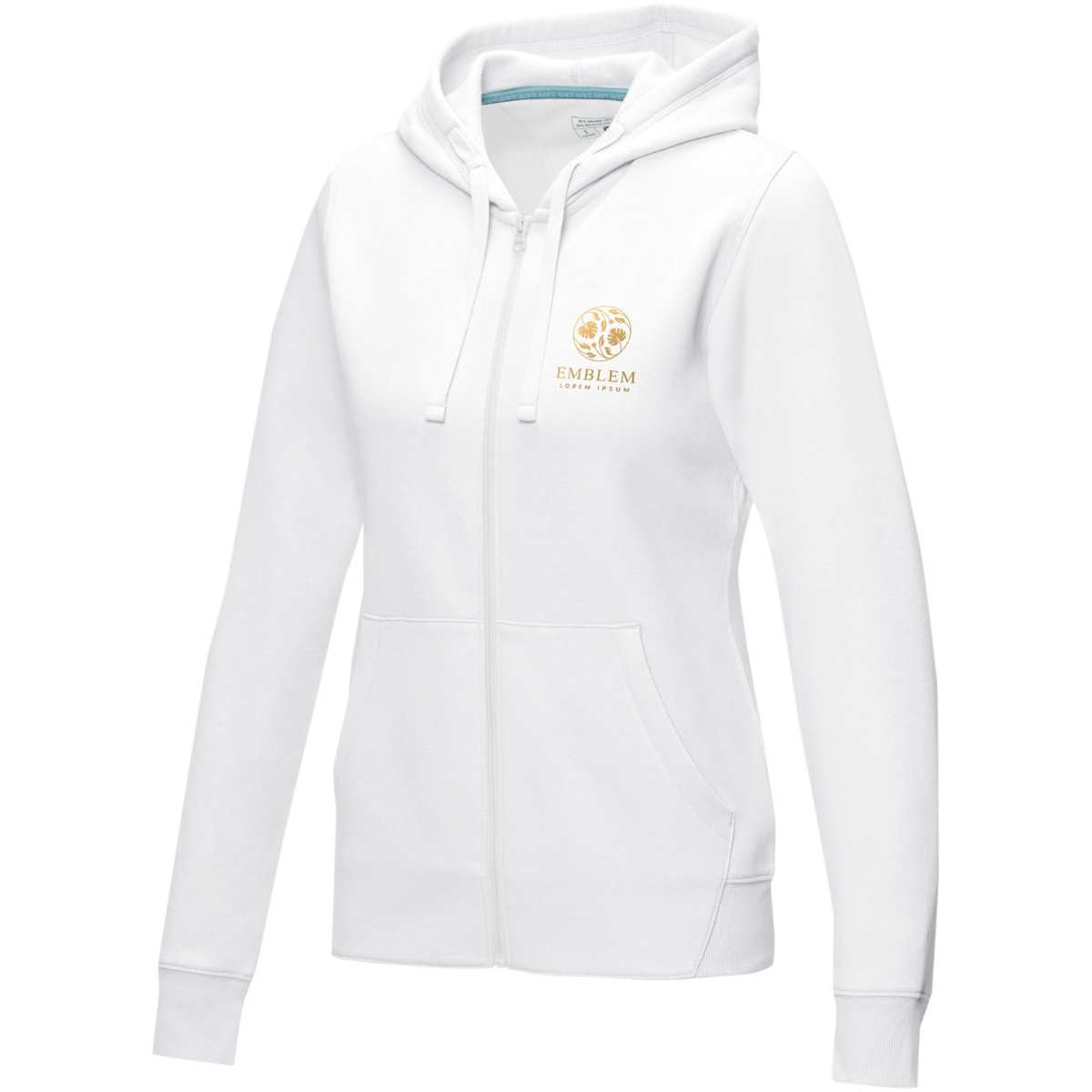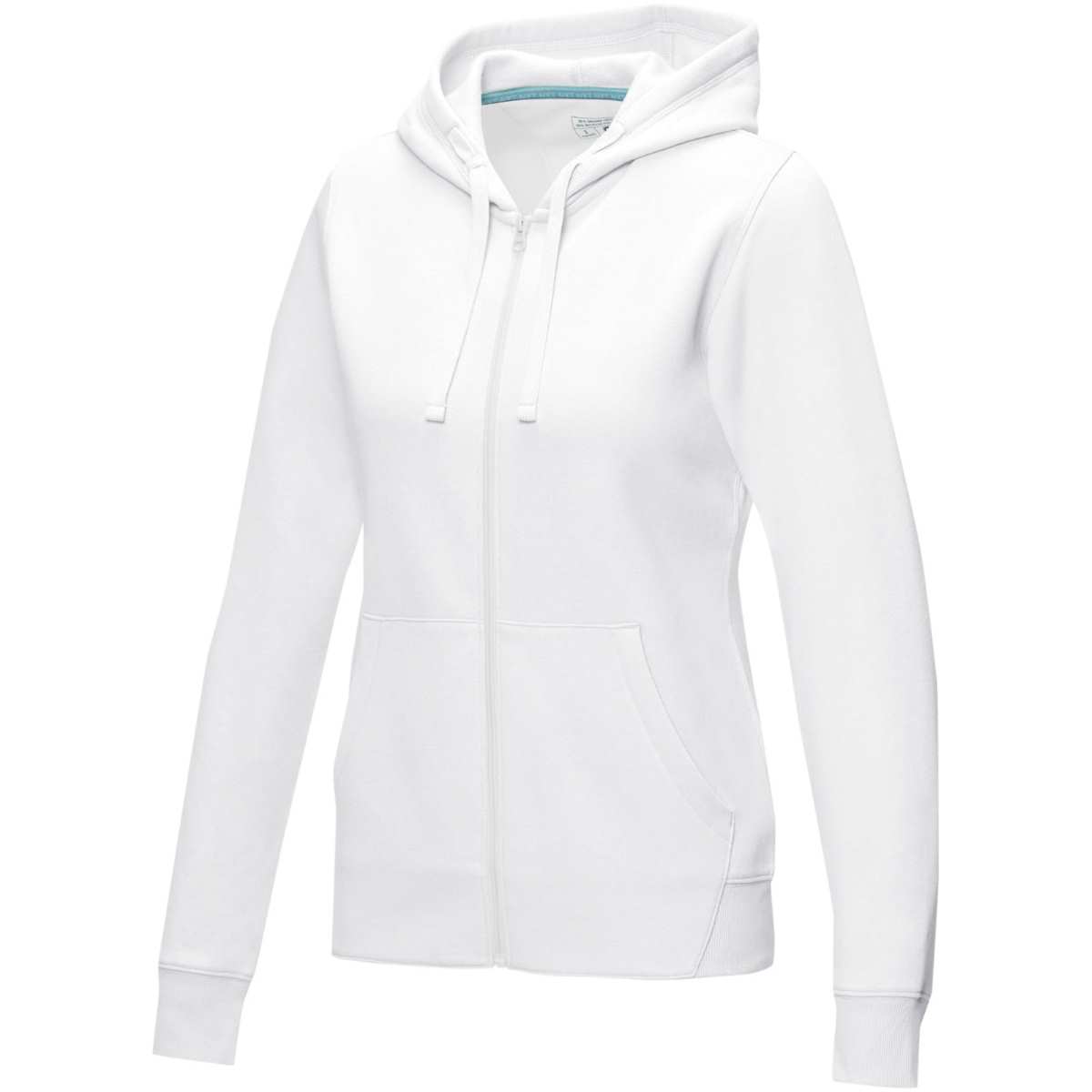 Kestävän kehityksen myynninedistämisvaatteet. Edessä keskellä GRS-sertifioitu vetoketju. Hupussa on GOTS-sertifioitu kiristysnyöri. Kapeneva vyötärö parantaa istuvuutta. Kengurutasku. Harjattu sisäpuoli. Neuleresorit. Neuleresorien alareuna. Kaksivärinen merkkikaulanauha. Puolikuumuoto. Lämpösiirrettävä merkintä takaa käyttömukavuuden ilman lappuja.