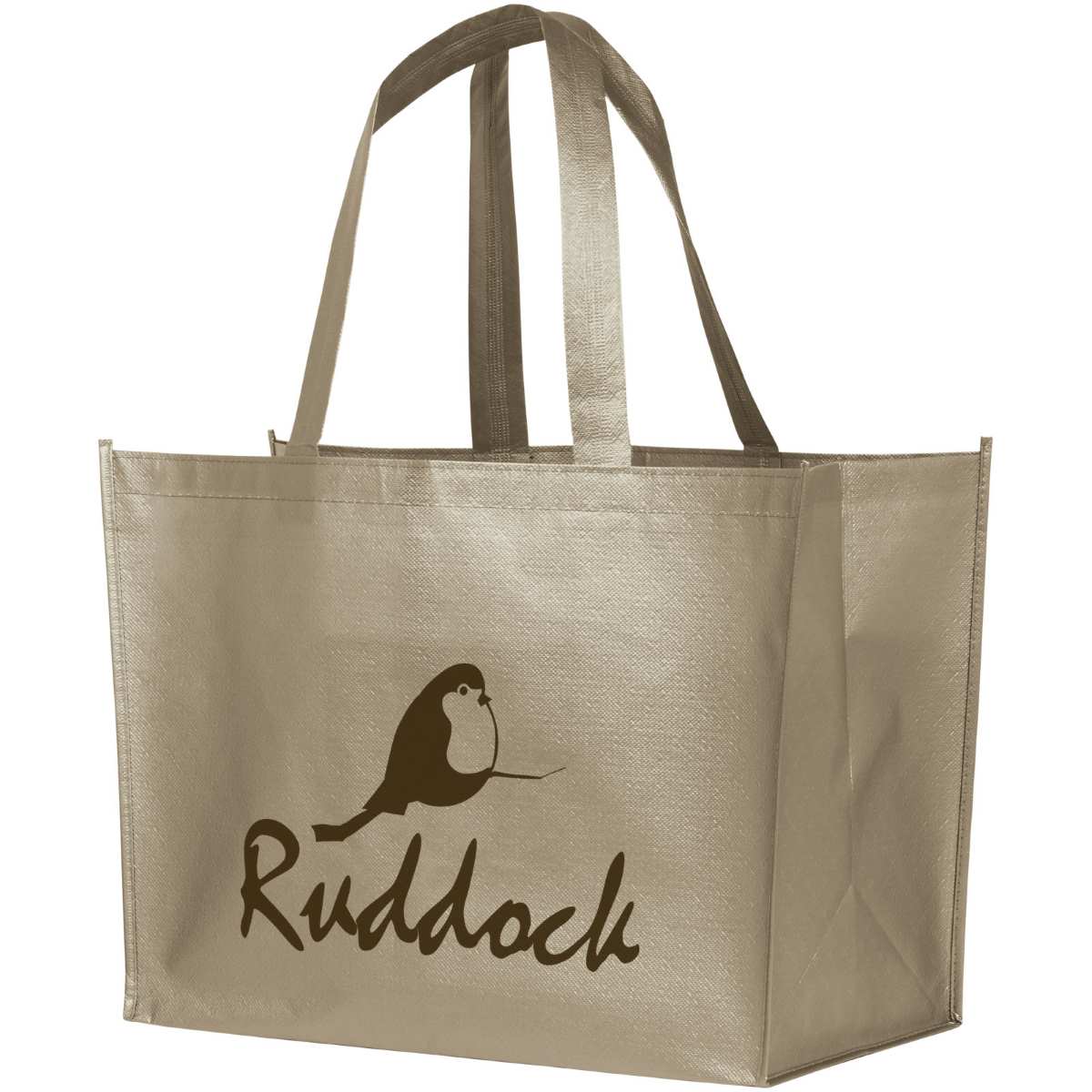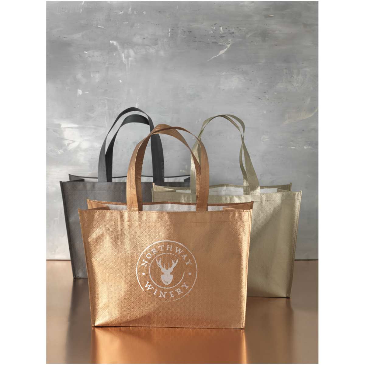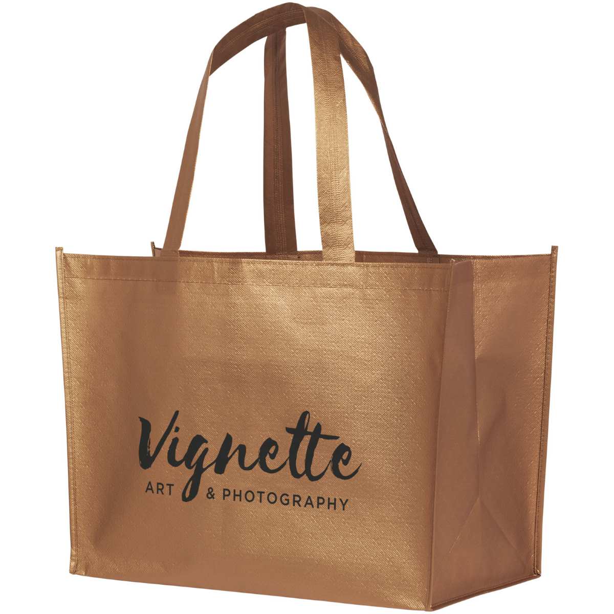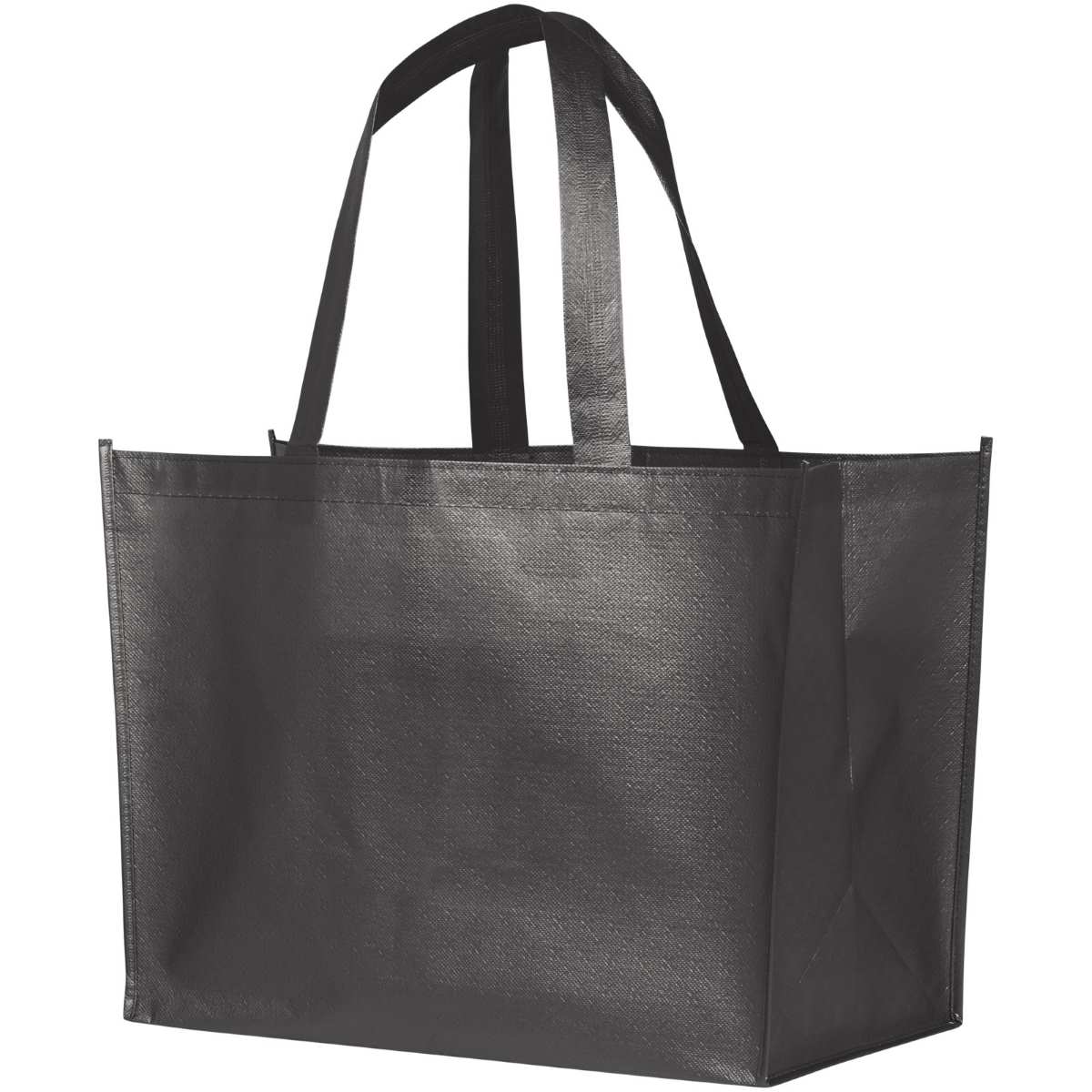 Kevyt, joustava ostoslaukku laminoidulla ja metallinhohtoisella ulkonäöllä. Valmistettu 80g laminoidusta, ei-kudotusta polypropeenista.