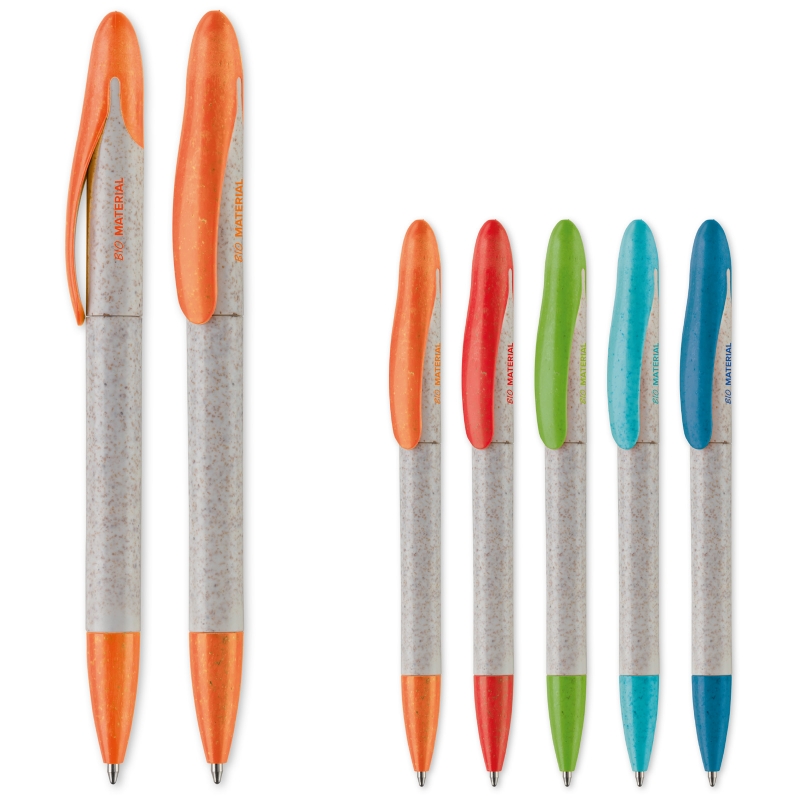 Ekologinen TopEarth kuulakärkikynä värillisellä kärjellä ja pidikkeellä, varustettu kääntömekanismilla. Tämä kuulakärkikynä on valmistettu 60% vehnän oljista ja 40% ABS muovista. Sininen kirjoitus.