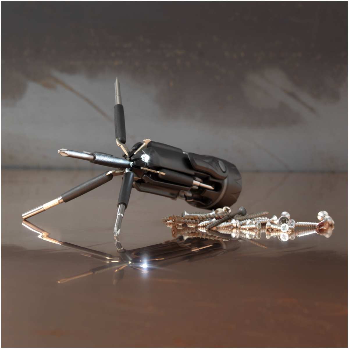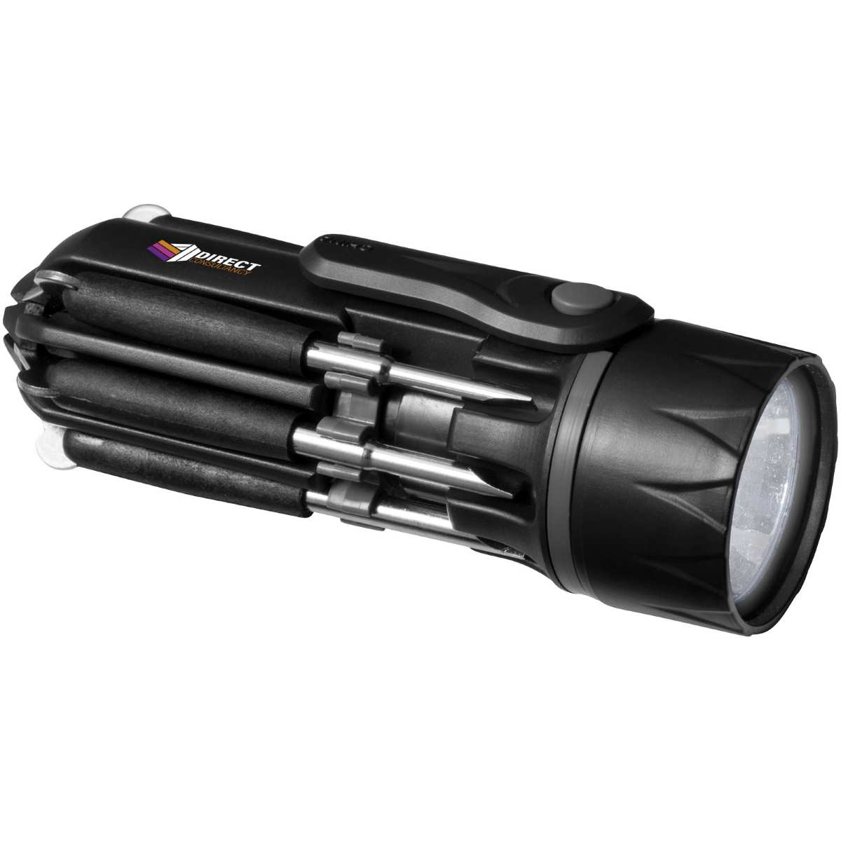 Loistava kodin työkalu, jossa on 1 LED-valo, 3 Phillips-päätä, 3 litteää päätä, ja pieni silmälasityökalu ruuvattavalla päällä. Paina painiketta kerran käyttääksesi taskulamppua ja uudelleen käyttääksesi LED- valoa valaisemaan työkaluja. Pakattu STAC-lahjapakkaukseen. Sisältää paristot. Ylellinen design.