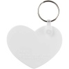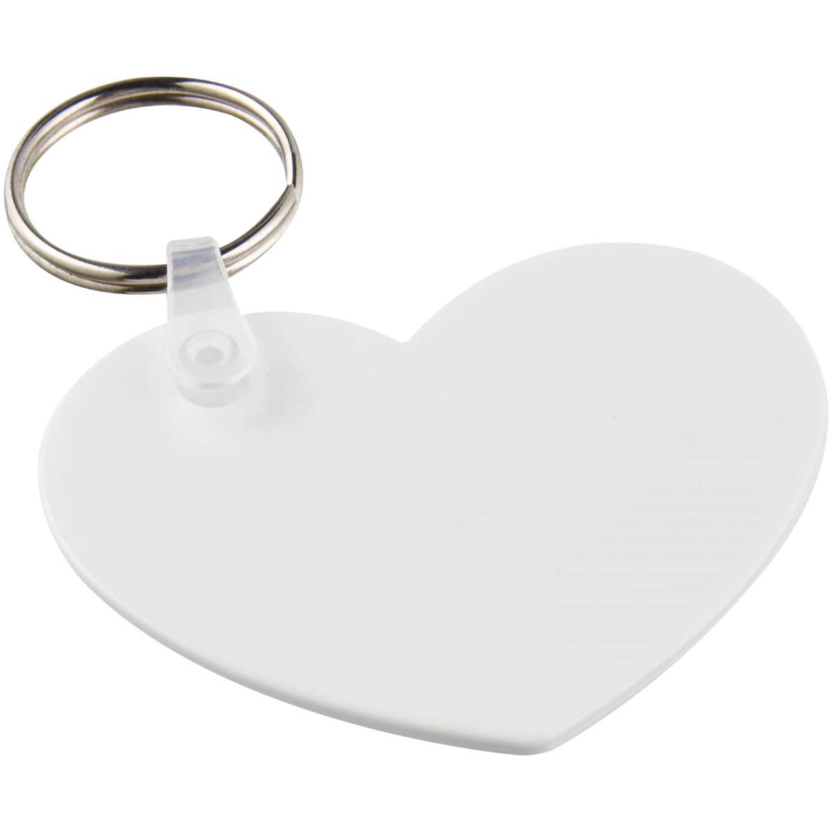 Valkoinen sydämenmuotoinen avaimenperä, jossa on metallinen avainrengas. Metallirengas tekee profiilista litteän, mikä on ihanteellista postituksen kannalta.