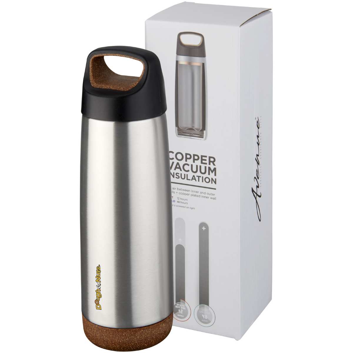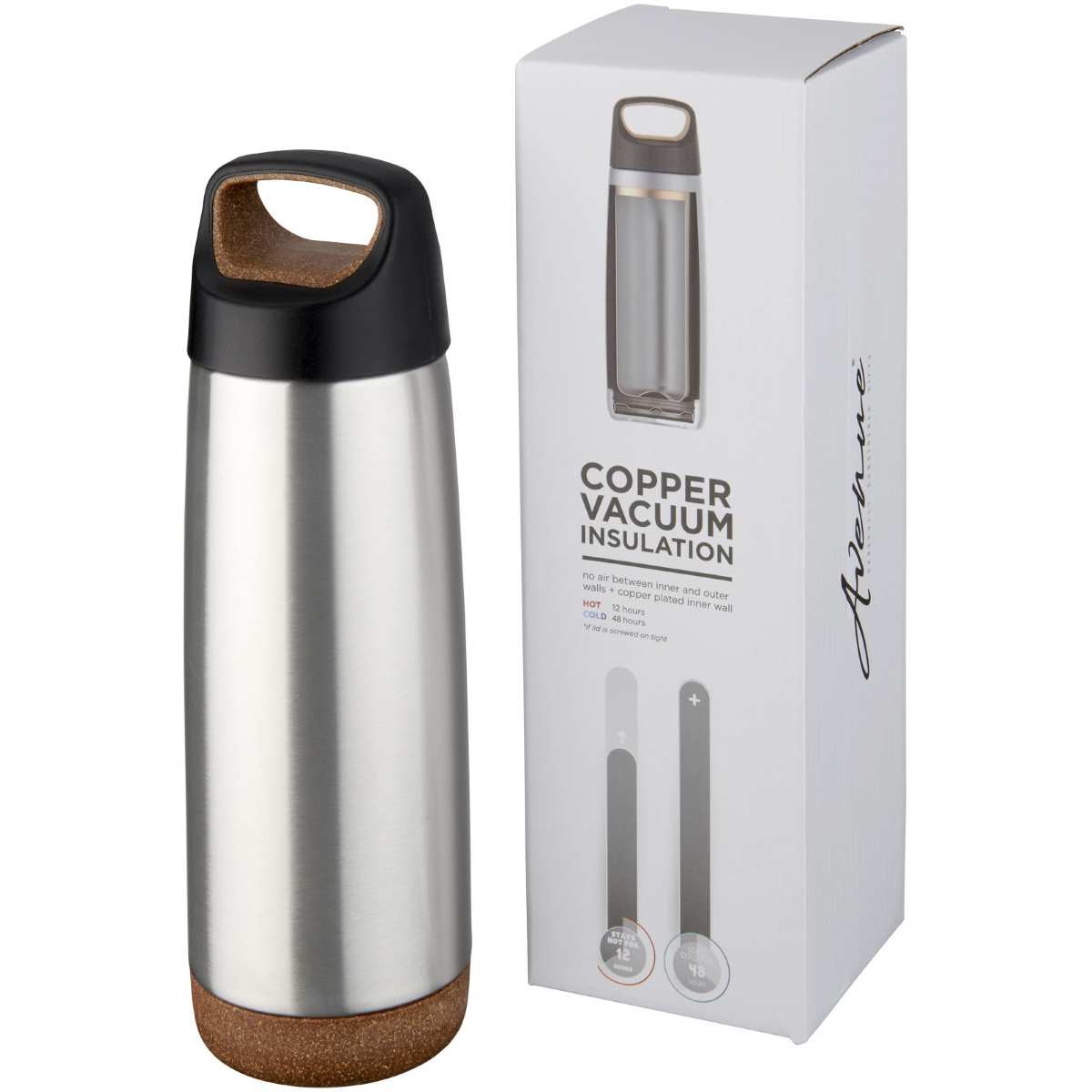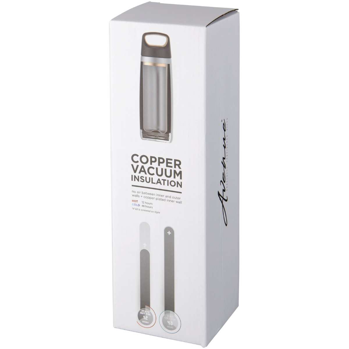 Valhalla 600 ml:n kuparivakuumi eristetty juomapullo. Kestävä, kaksinkertainen tyhjiörakenne kuparieristyksellä pitää juoman kylmänä 48 tuntia ja kuumana vähintään 12 tuntia. Rakenne estää myös veden kondensoitumisen pullon ulkopuolelle. Kierrekansi, liukumista estävä pohja. Tilavuus 600ml. Toimitetaan Avenue-lahjapakkauksessa.