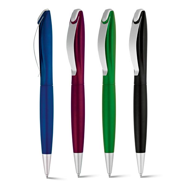 Kuulakärkikynä jossa sininen muste. Metallinen klipsi ja rungossa kaunis metallihohtoväri. Kynän klipsi on erilainen kuin normaalisti, joka lisää kynän tyylikkyyttä. Värivaihtoehtoina: viininpunainen, musta, sininen, vihreä ja oranssi.