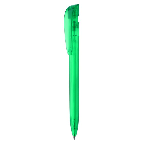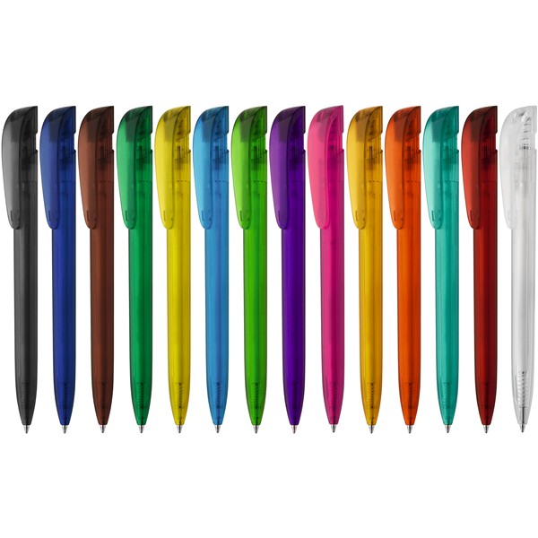 Näyttävän näköinen kynä, jossa läpikuultava värillinen runko.